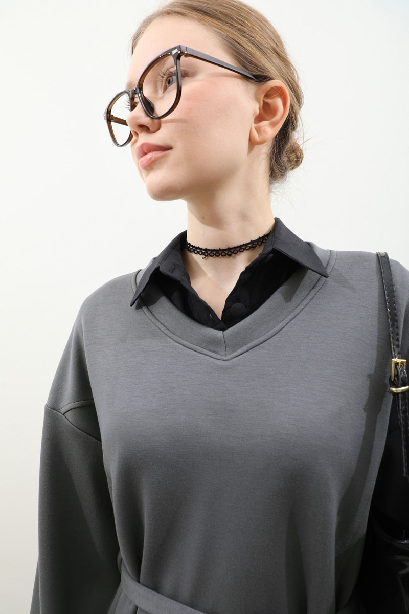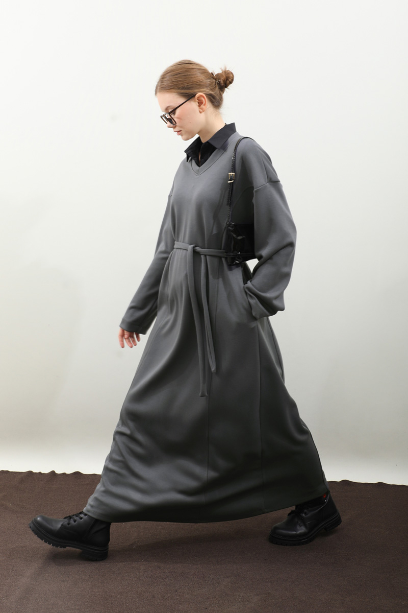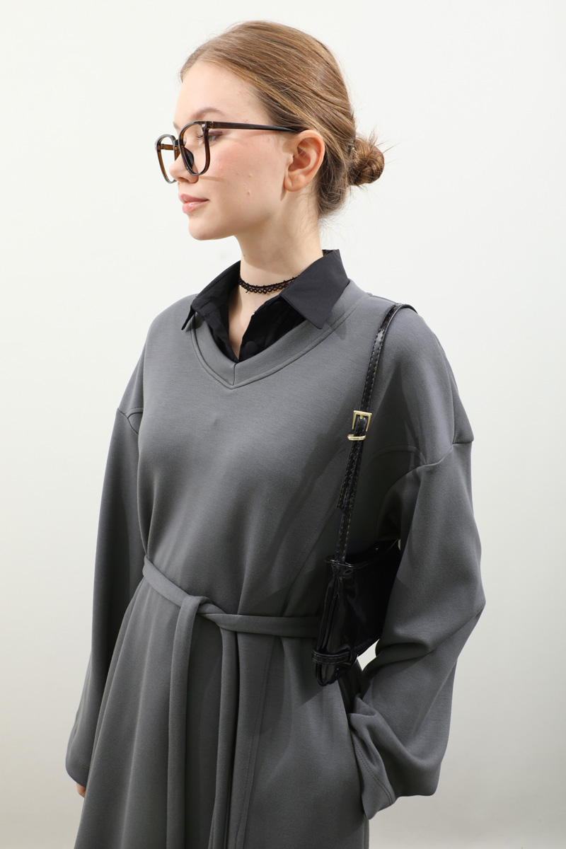 V Yaka Sweat Elbise Antrasit