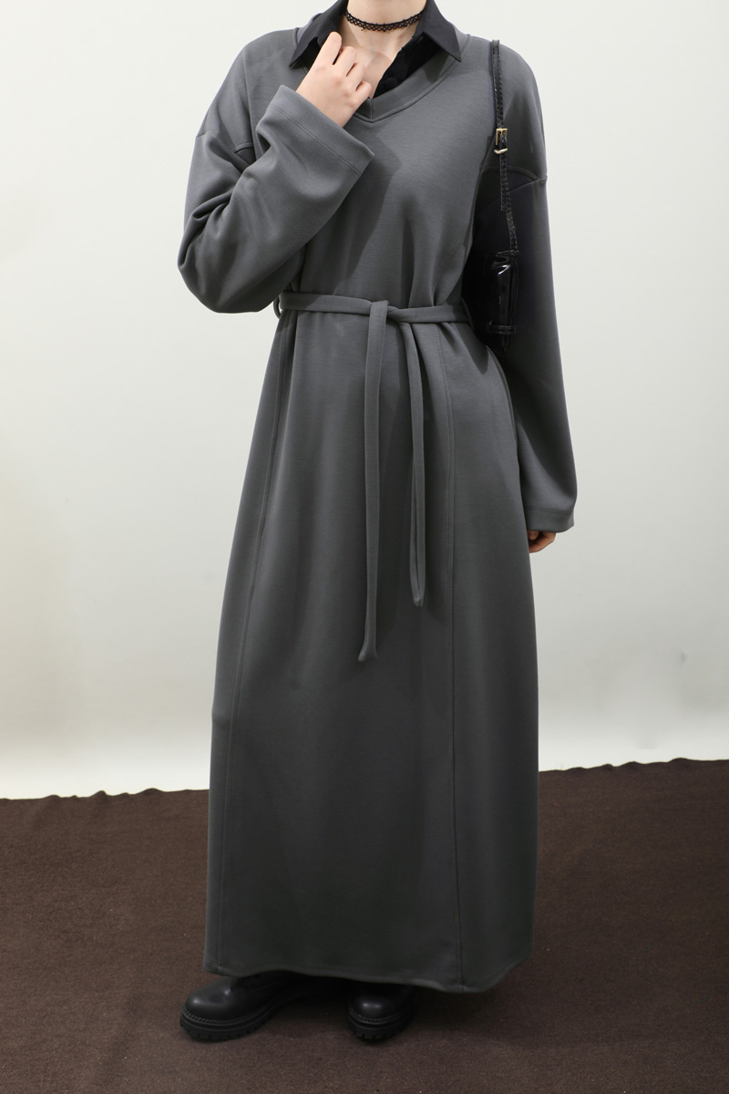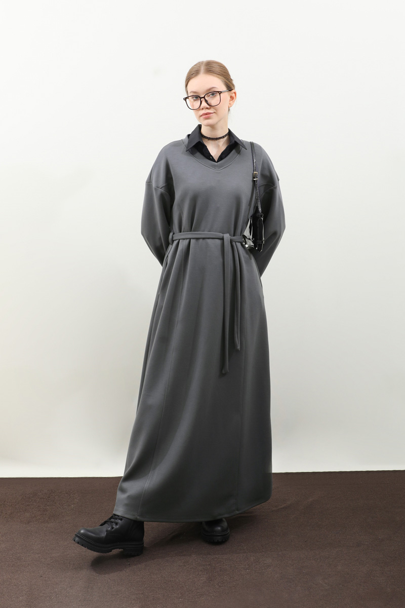 V Yaka Sweat Elbise Antrasit. V yakadır, düşük omuzludur, ön üç parçadan oluşur. Kuşaklıdır. Ceplidir, astarsızdır, iç göstermez. Günlük kullanım ve özel günlerinizde tercih edebilirsiniz.