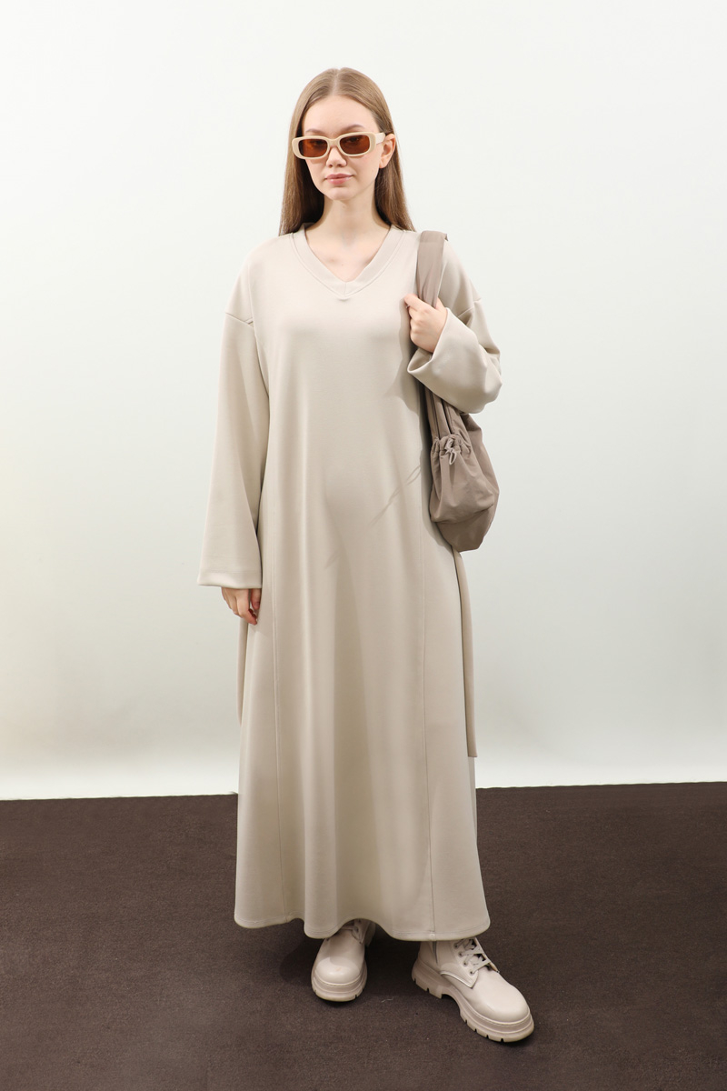 V Yaka Sweat Elbise Krem