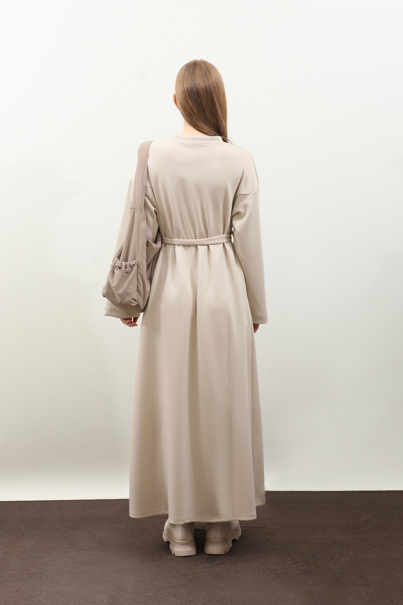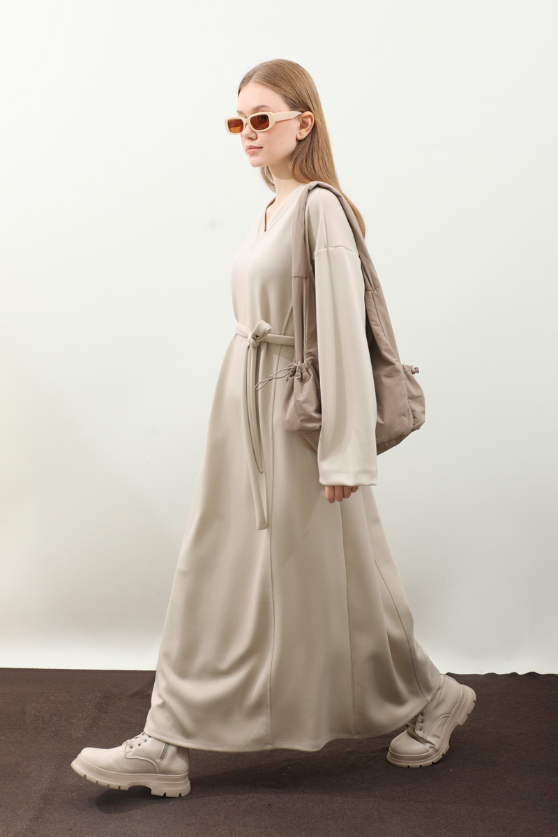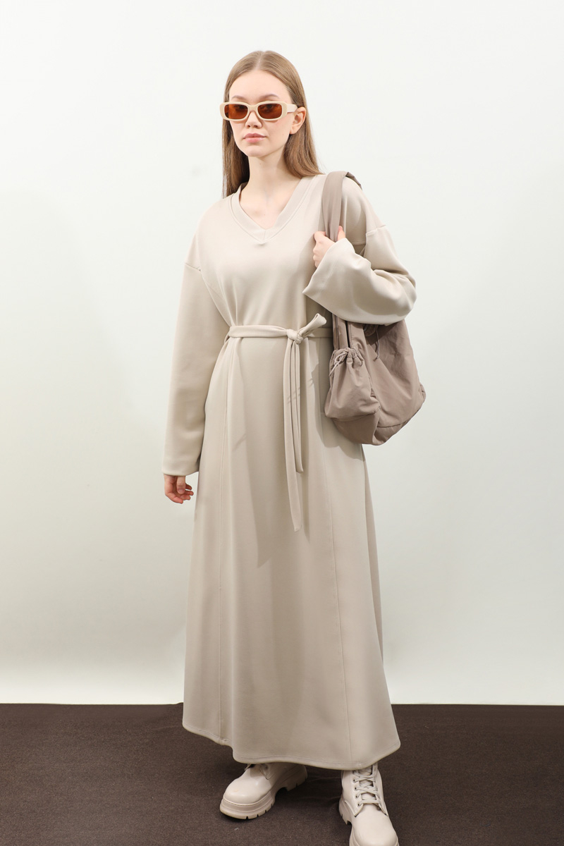 V Yaka Sweat Elbise Krem. V yakadır, düşük omuzludur, ön üç parçadan oluşur. Kuşaklıdır. Ceplidir, astarsızdır, iç göstermez. Günlük kullanım ve özel günlerinizde tercih edebilirsiniz.