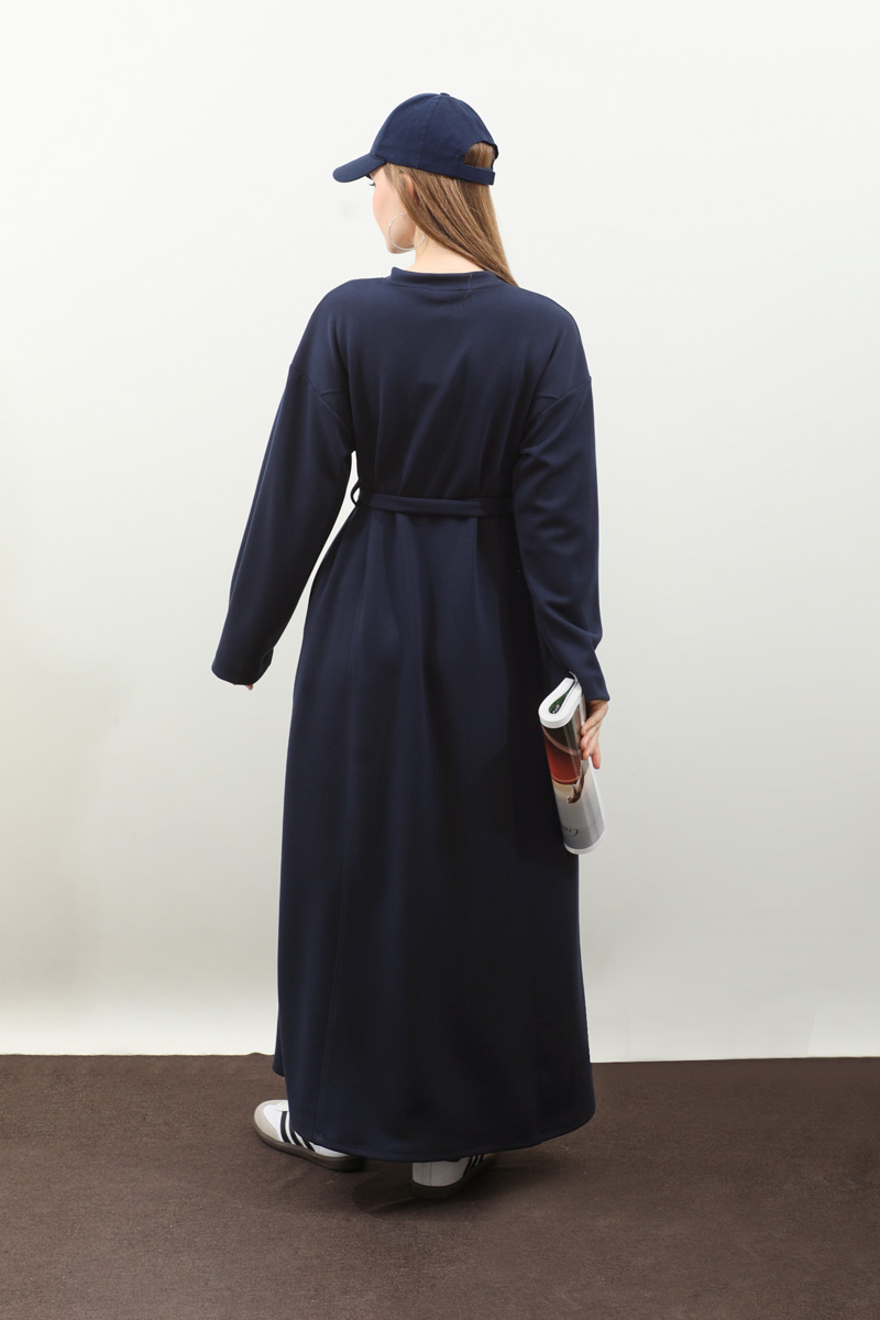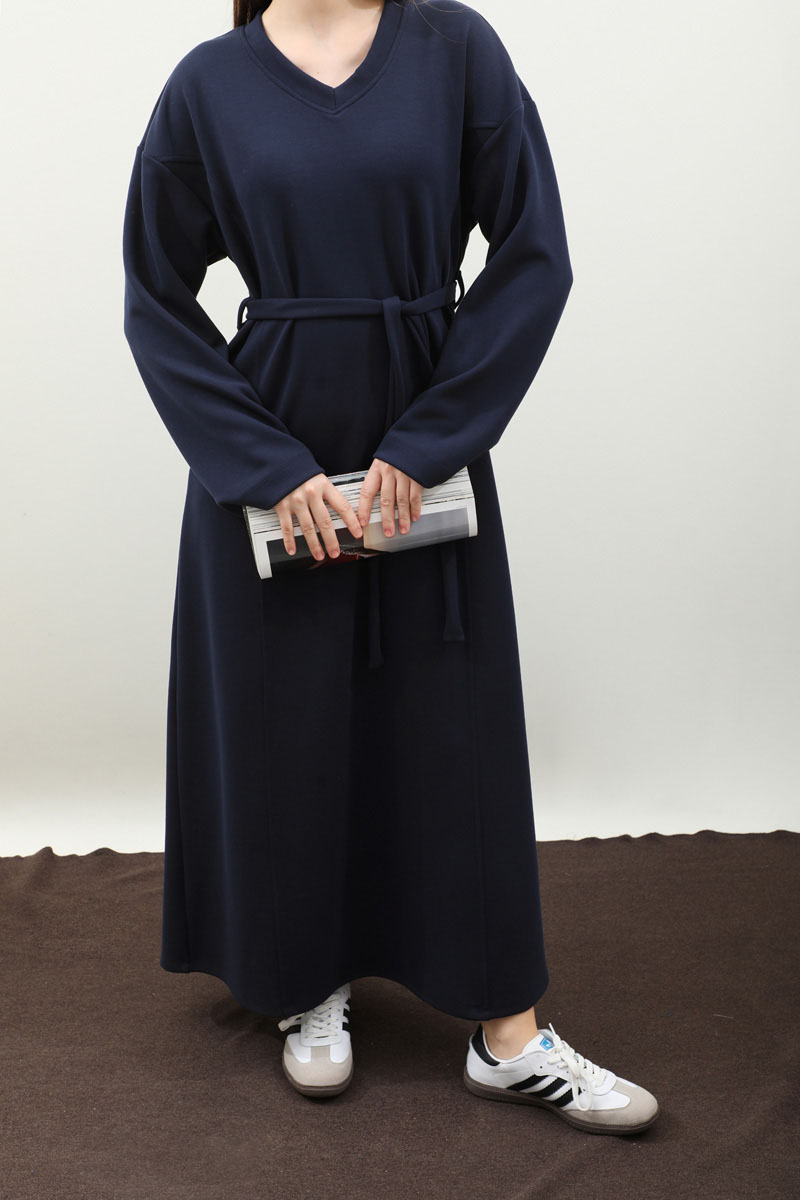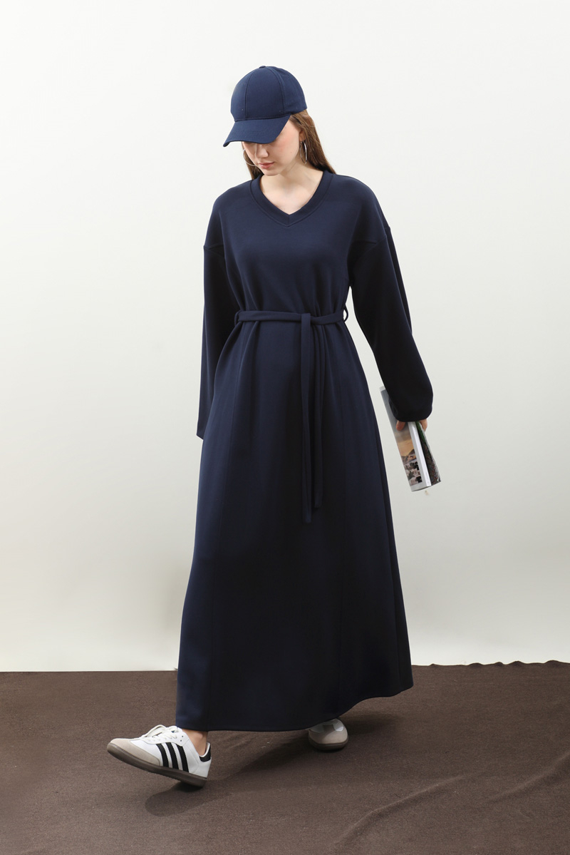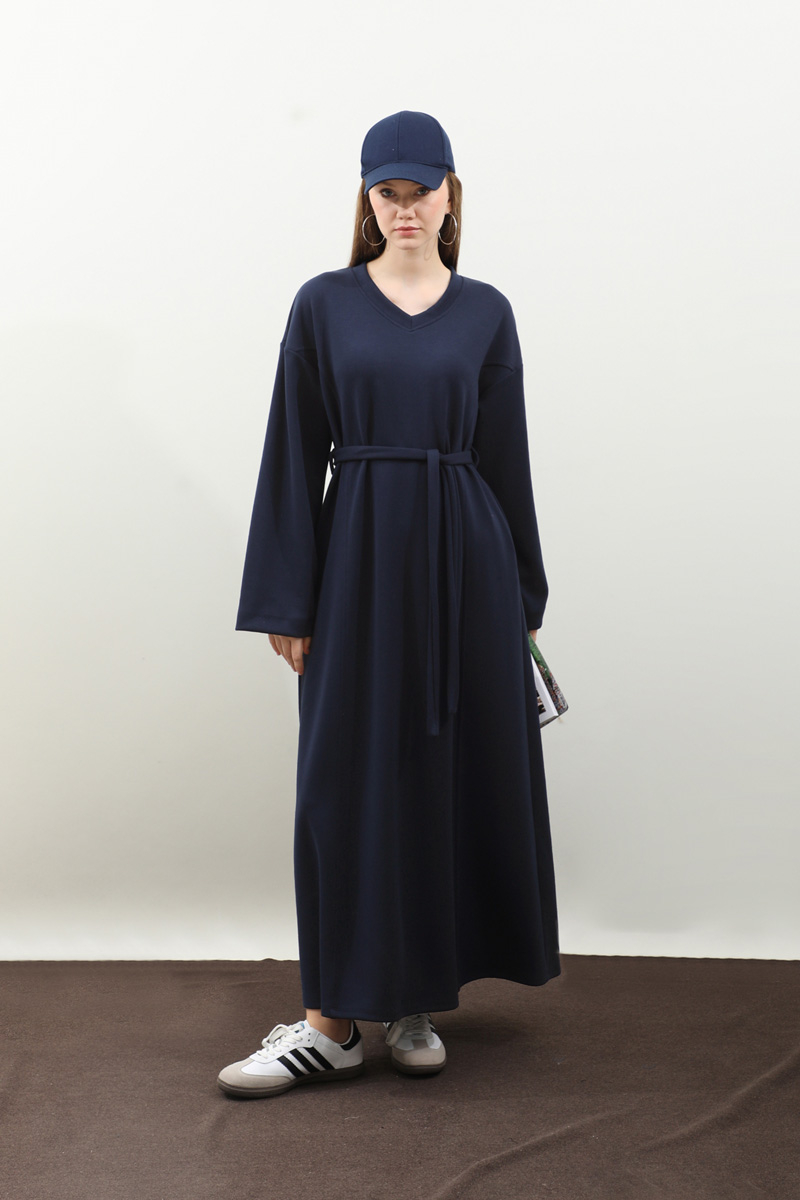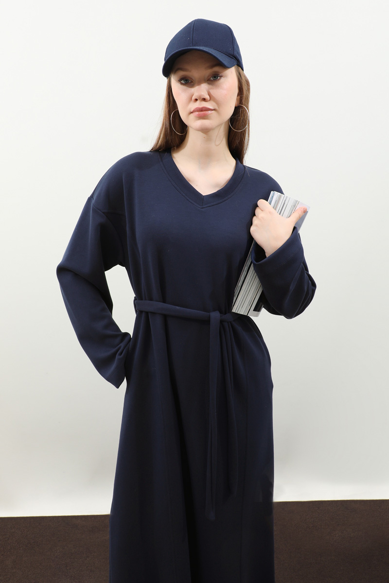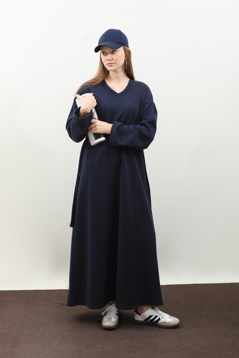 V Yaka Sweat Elbise Lacivert. V yakadır, düşük omuzludur, ön üç parçadan oluşur. Kuşaklıdır. Ceplidir, astarsızdır, iç göstermez. Günlük kullanım ve özel günlerinizde tercih edebilirsiniz.