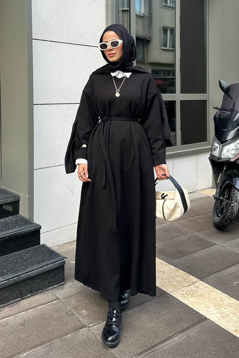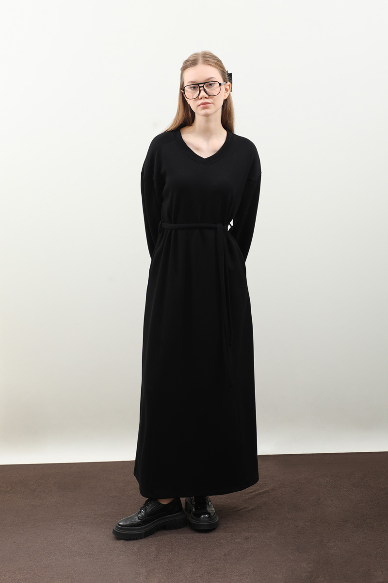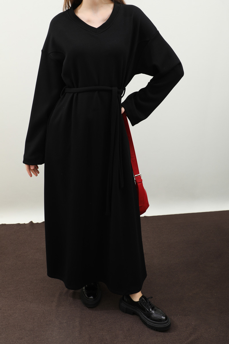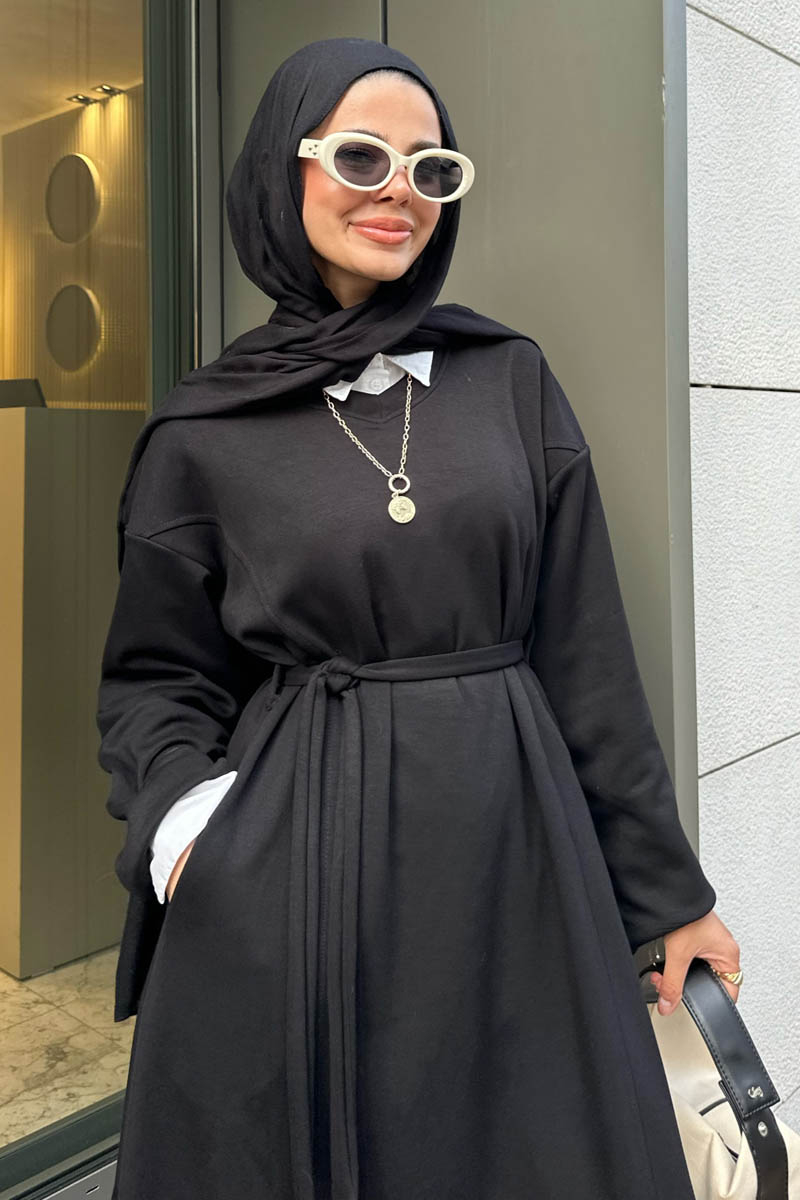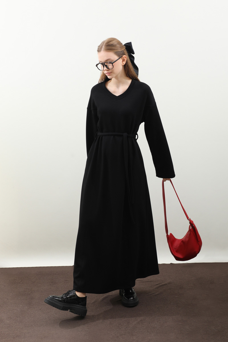V Yaka Sweat Elbise Siyah. V yakadır, düşük omuzludur, ön üç parçadan oluşur. Kuşaklıdır. Ceplidir, astarsızdır, iç göstermez. Günlük kullanım ve özel günlerinizde tercih edebilirsiniz.