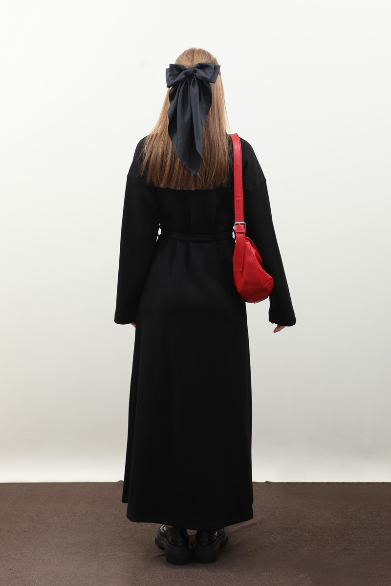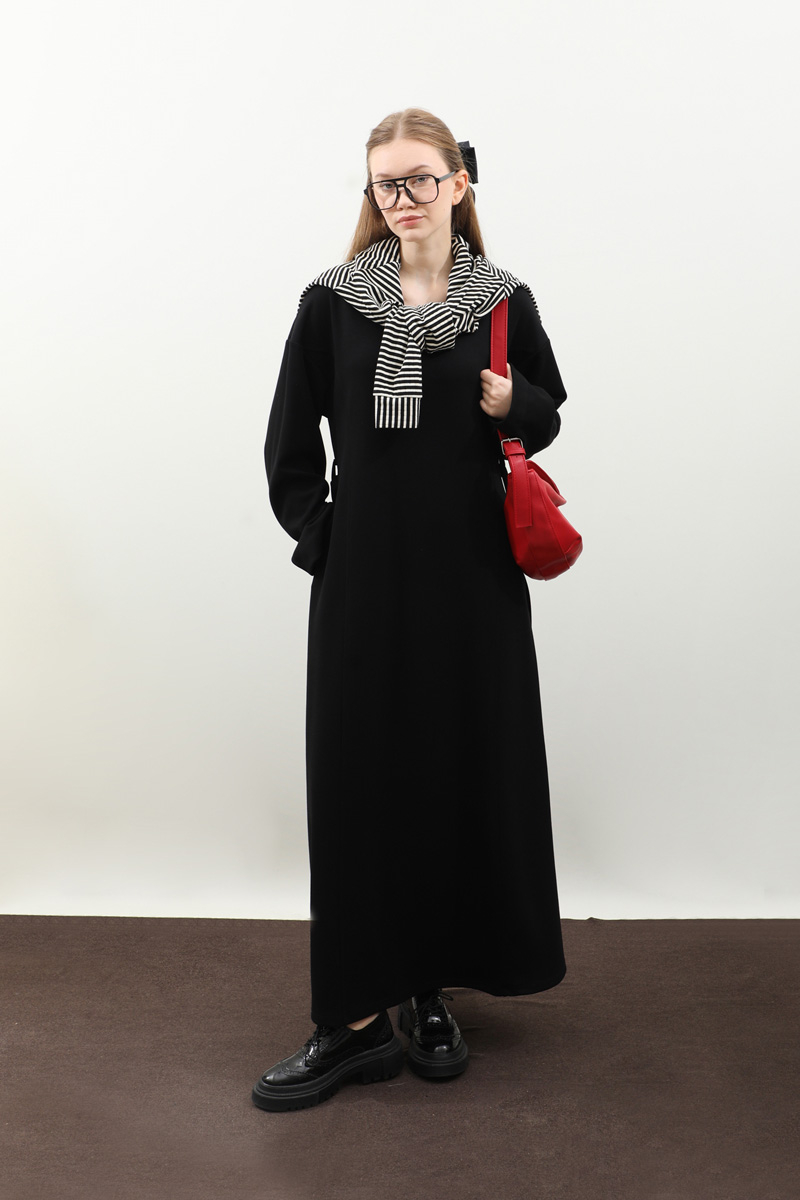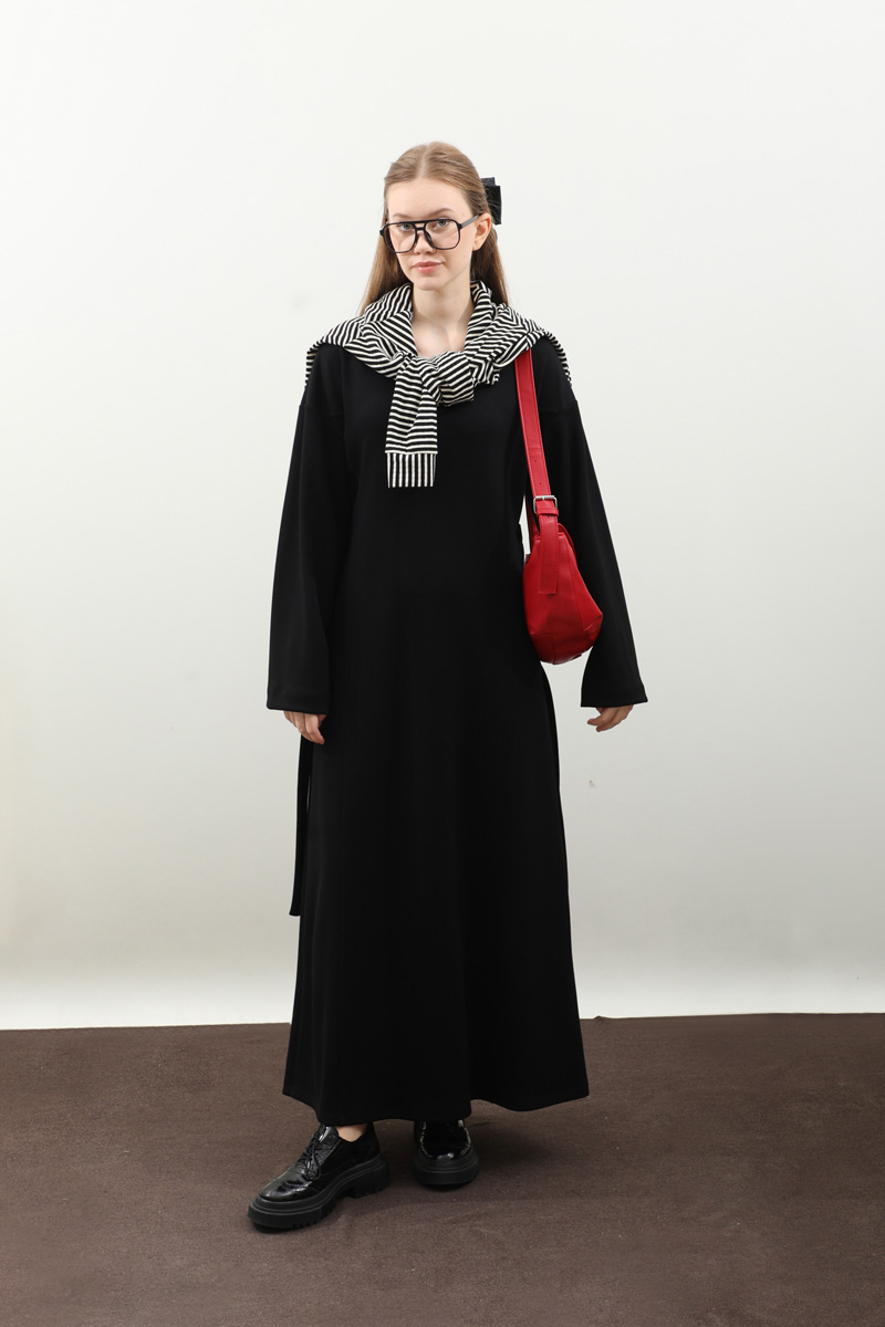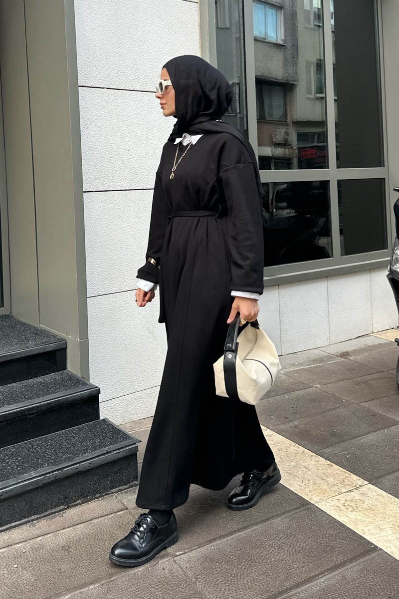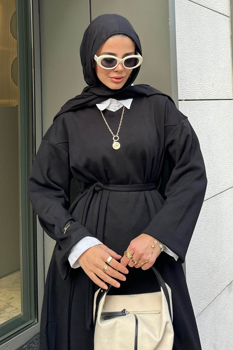 V Yaka Sweat Elbise Siyah. V yakadır, düşük omuzludur, ön üç parçadan oluşur. Kuşaklıdır. Ceplidir, astarsızdır, iç göstermez. Günlük kullanım ve özel günlerinizde tercih edebilirsiniz.