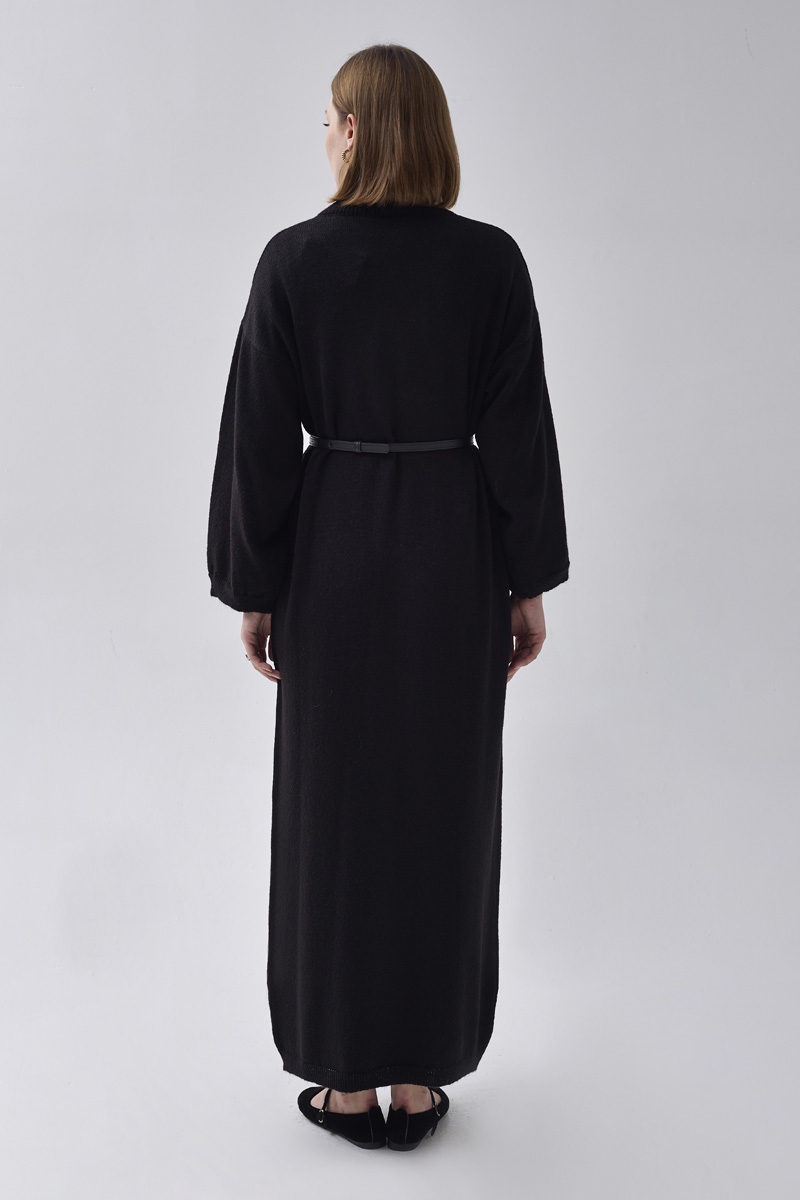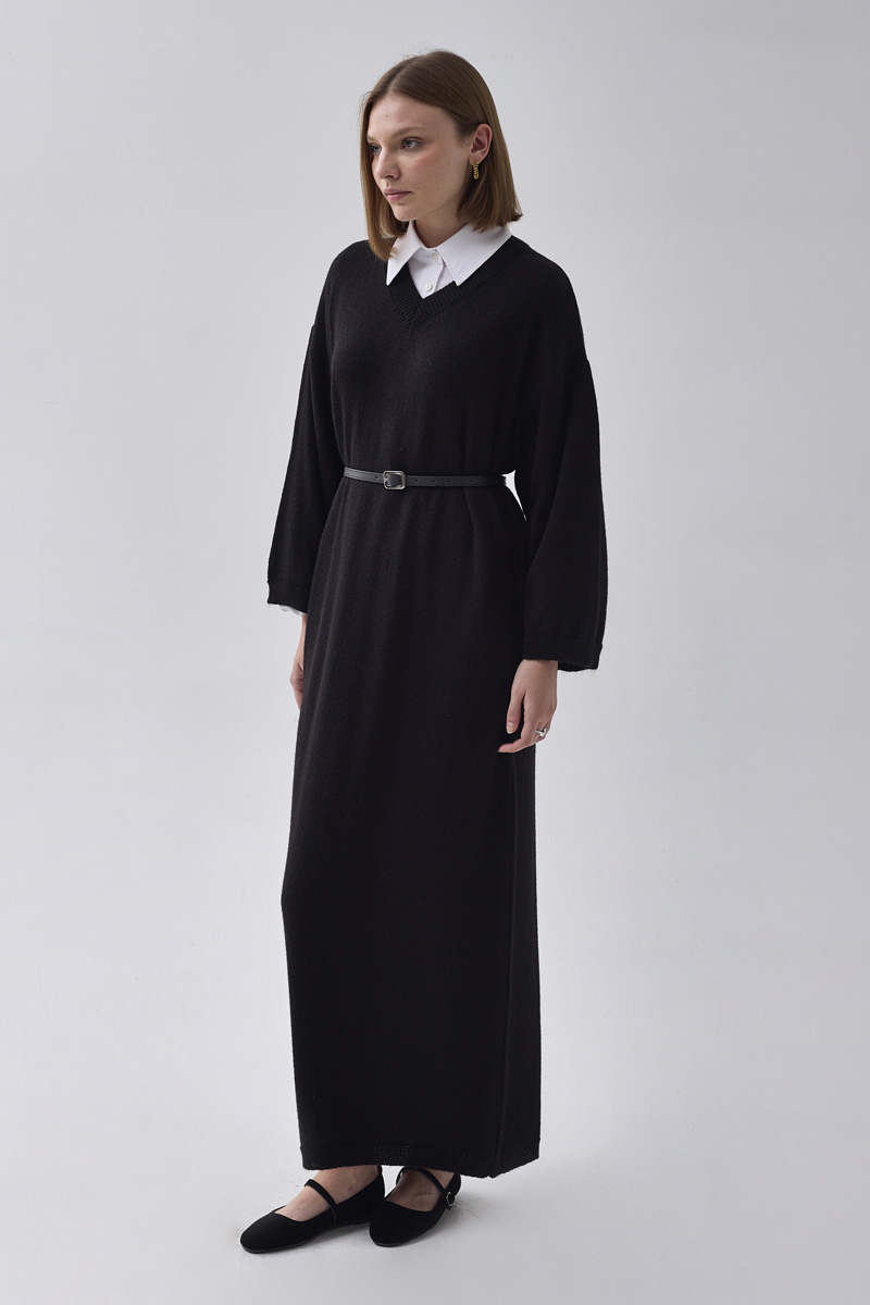 V Yaka Triko Elbise Siyah