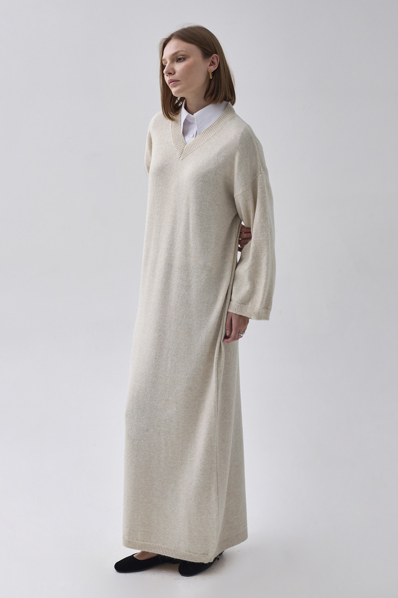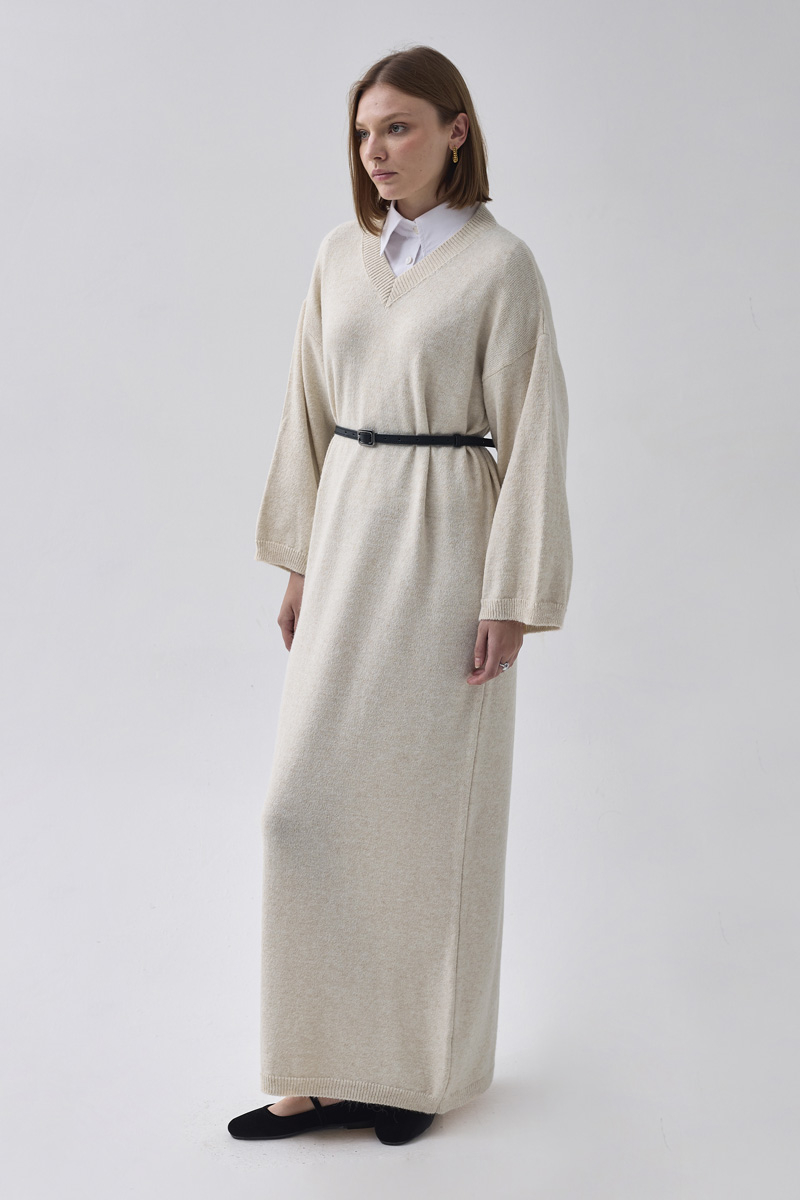 V Yaka Triko Elbise Taş