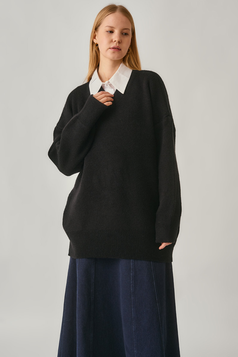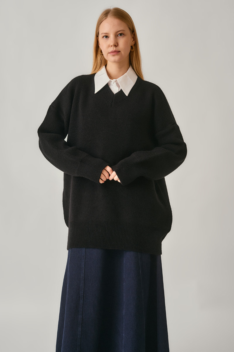 V Yaka Triko Kazak Siyah, sade çizgisini modern bir siluetle buluşturuyor. Yumuşak triko dokusu ve rahat kalıbıyla gün boyu konfor sunarken, oversize formu ile zamansız bir şıklık yaratır. Klasik beyaz gömleklerle veya denim parçalarla kombinlenerek zahmetsiz bir stil elde etmenizi sağlar. Gündelik şehir hayatından ofis stiline kadar çok yönlü bir kullanım imkânı sunar.