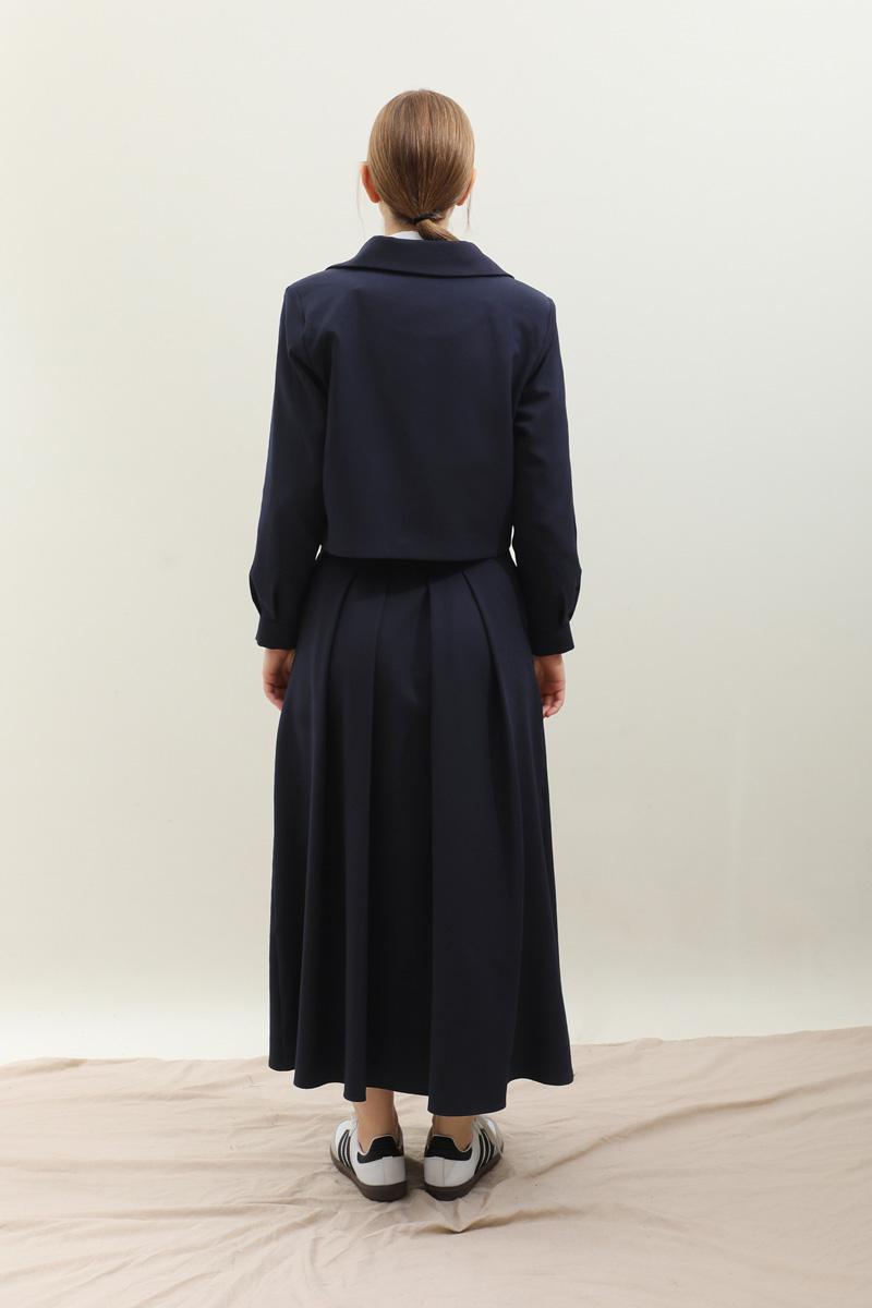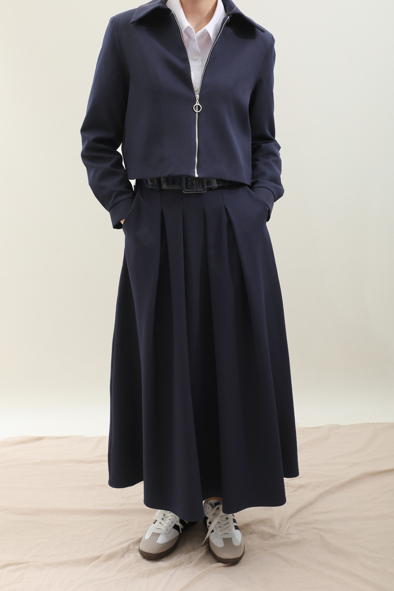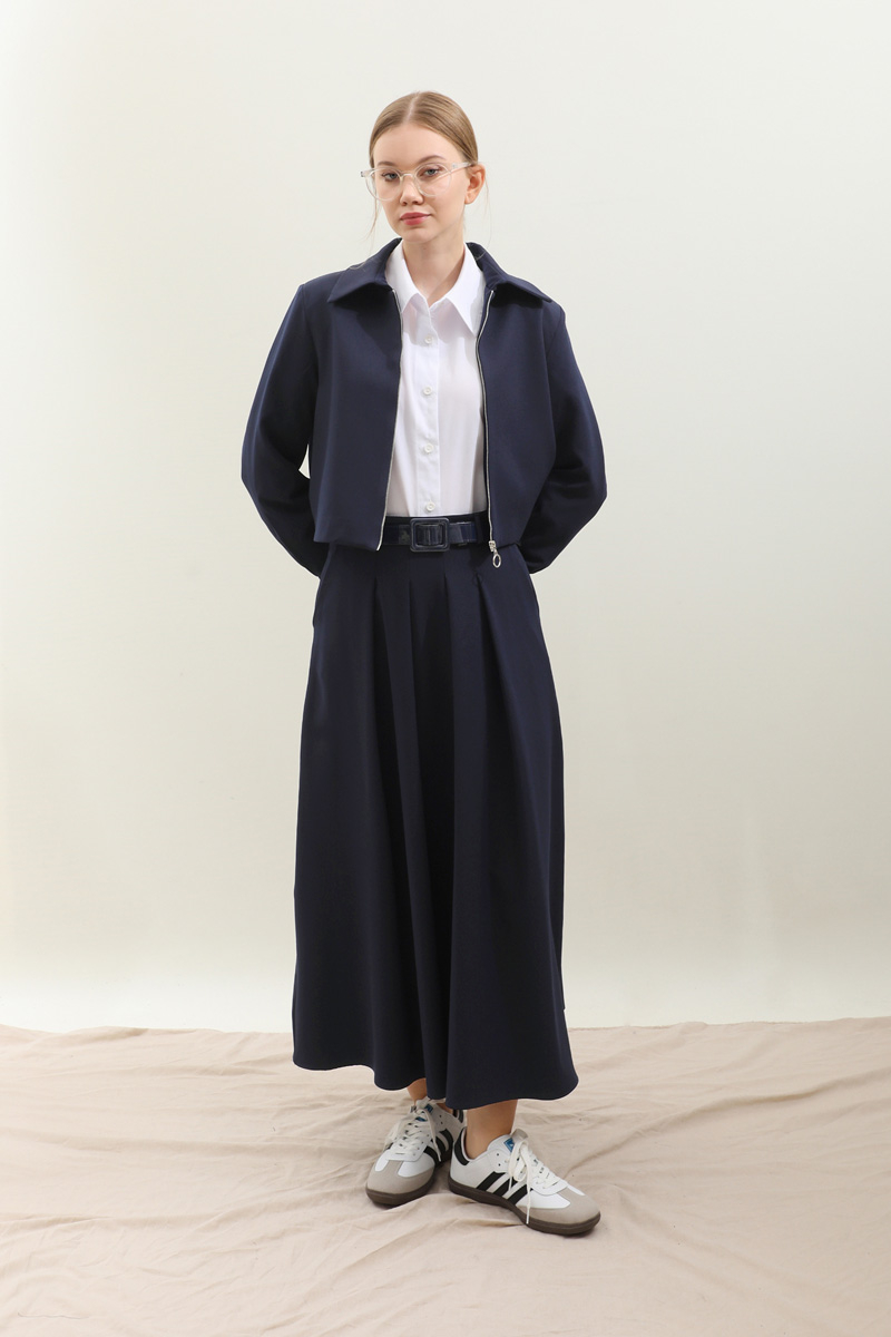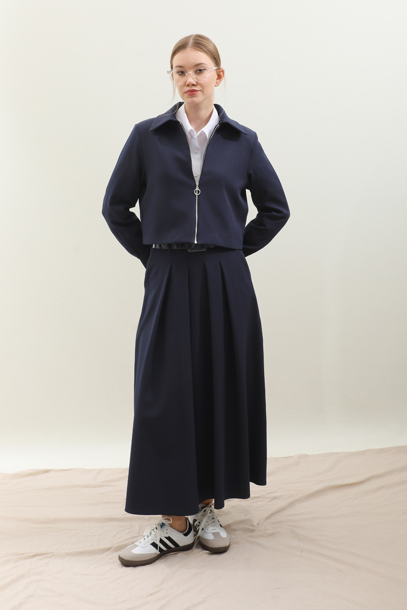 Vatkalı Ceket Etek Takım Lacivert. Ceket gömlek yakadır, vatkalıdır önden fermuarlıdır. Ceket astarlıdır, manşetinde pile detaylıdır, cepsizdir. Etek pile detaylıdır, yandan gizli fermuarlıdır. ceplidir, etek astarsızdır. Günlük kullanım ve özel günlerinizde tercih edebilirsiniz.