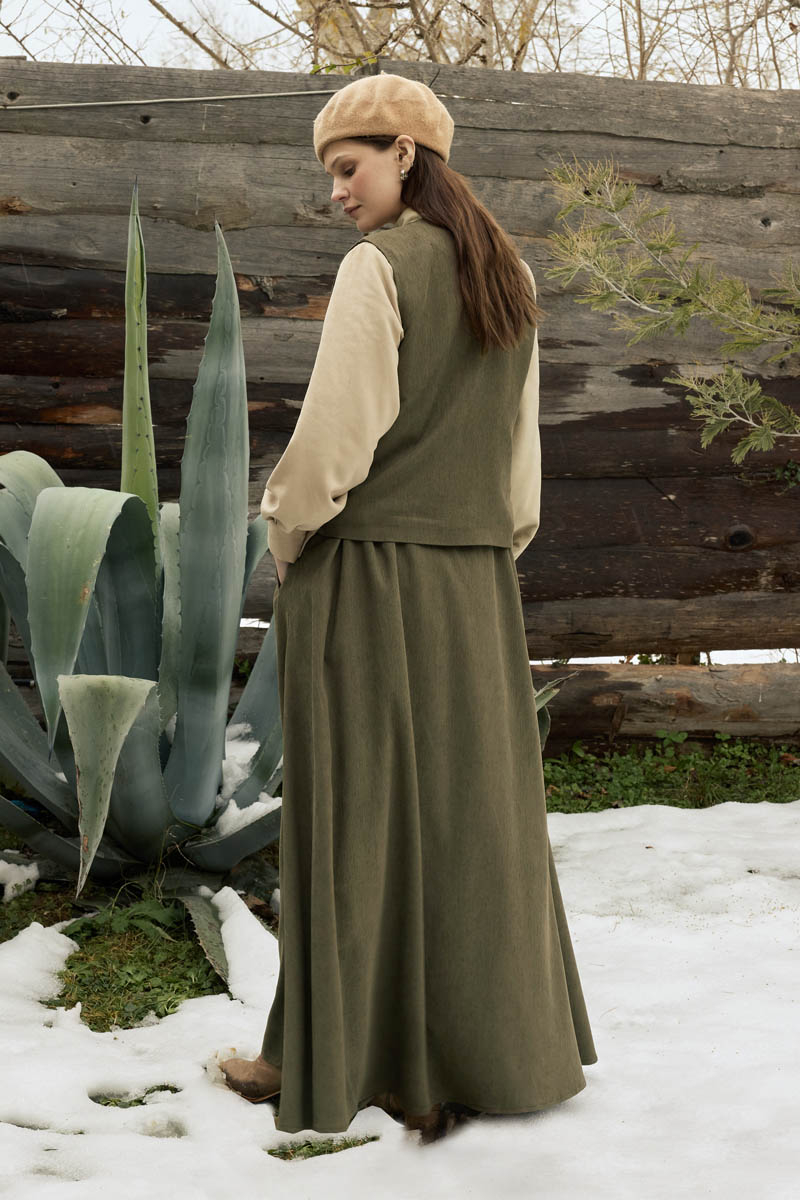 Inspired by nostalgic lines, this design offers a natural and calm style. The ribbed velvet texture adds depth and character to the set, while the harmony between the vest and skirt creates a cohesive look. The lace-up detail on the front of the vest brings a distinctive accent to the design, and the skirt’s relaxed fit ensures all-day comfort. With its nature-inspired color tone and clean silhouette, it can be easily preferred for both everyday outfits and more refined urban looks. This versatile set can be effortlessly styled with knit tops, basic shirts, and boots.