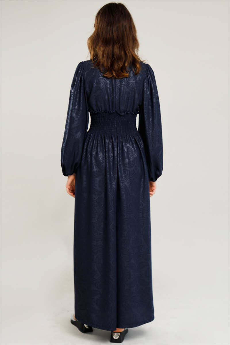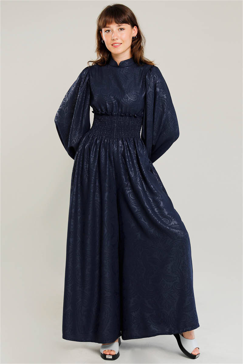 Tippet. Elastic waist. It has a back zipper. It doesn't show inside.