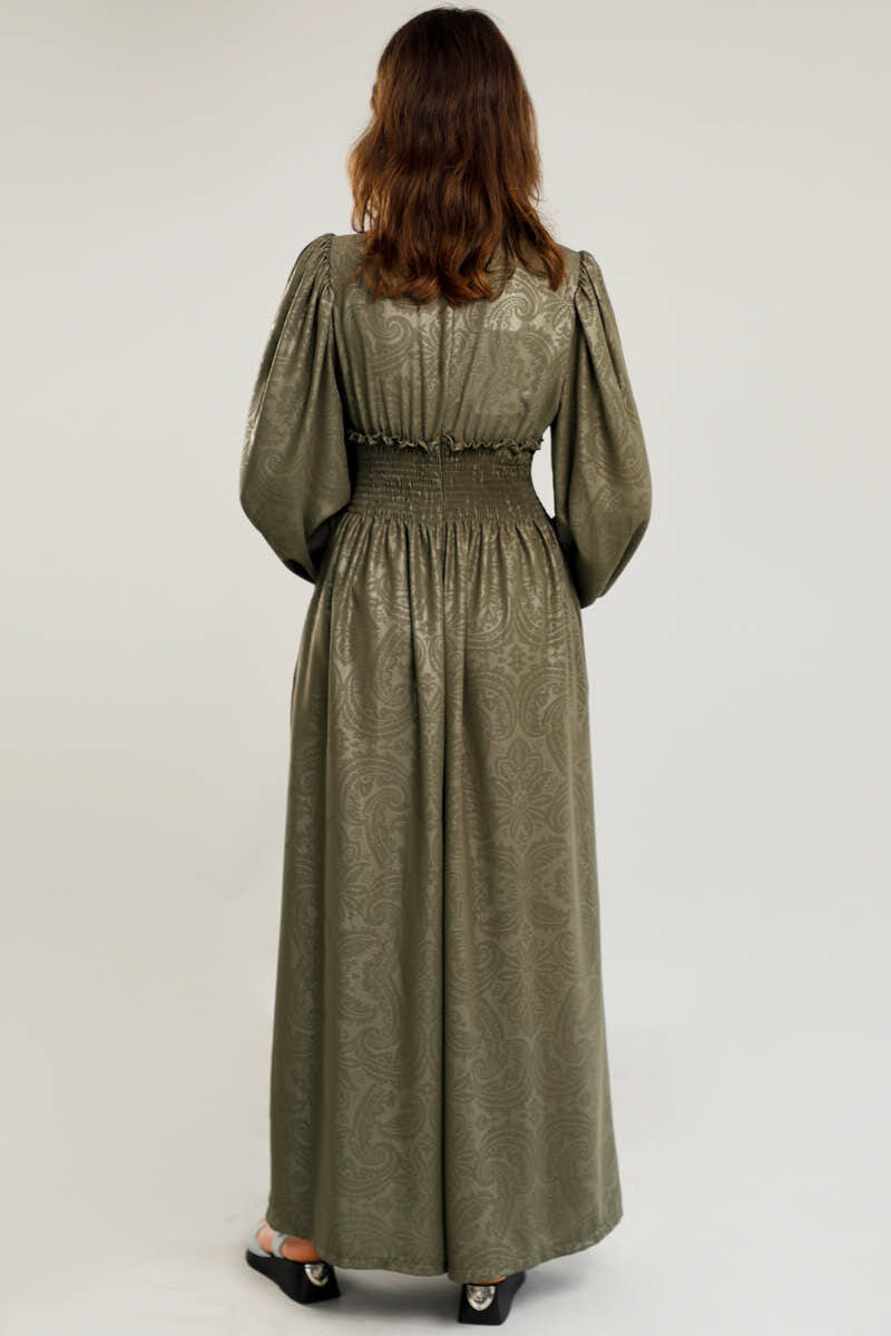 Hakim yaka. Belden lastikli. Arkadan fermuarlıdır. İç göstermez.