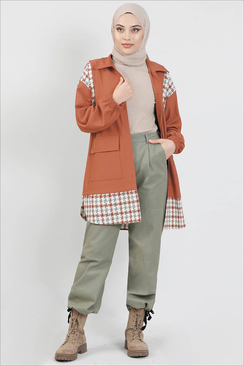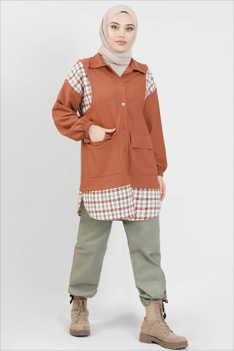 Shirt collar, two front pockets, plaid fabric detail, vest look.