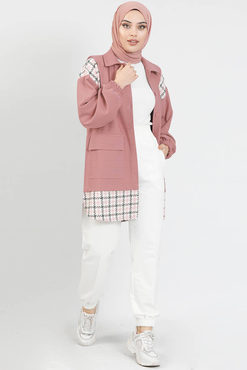 Shirt collar, two front pockets, plaid fabric detail, vest look.