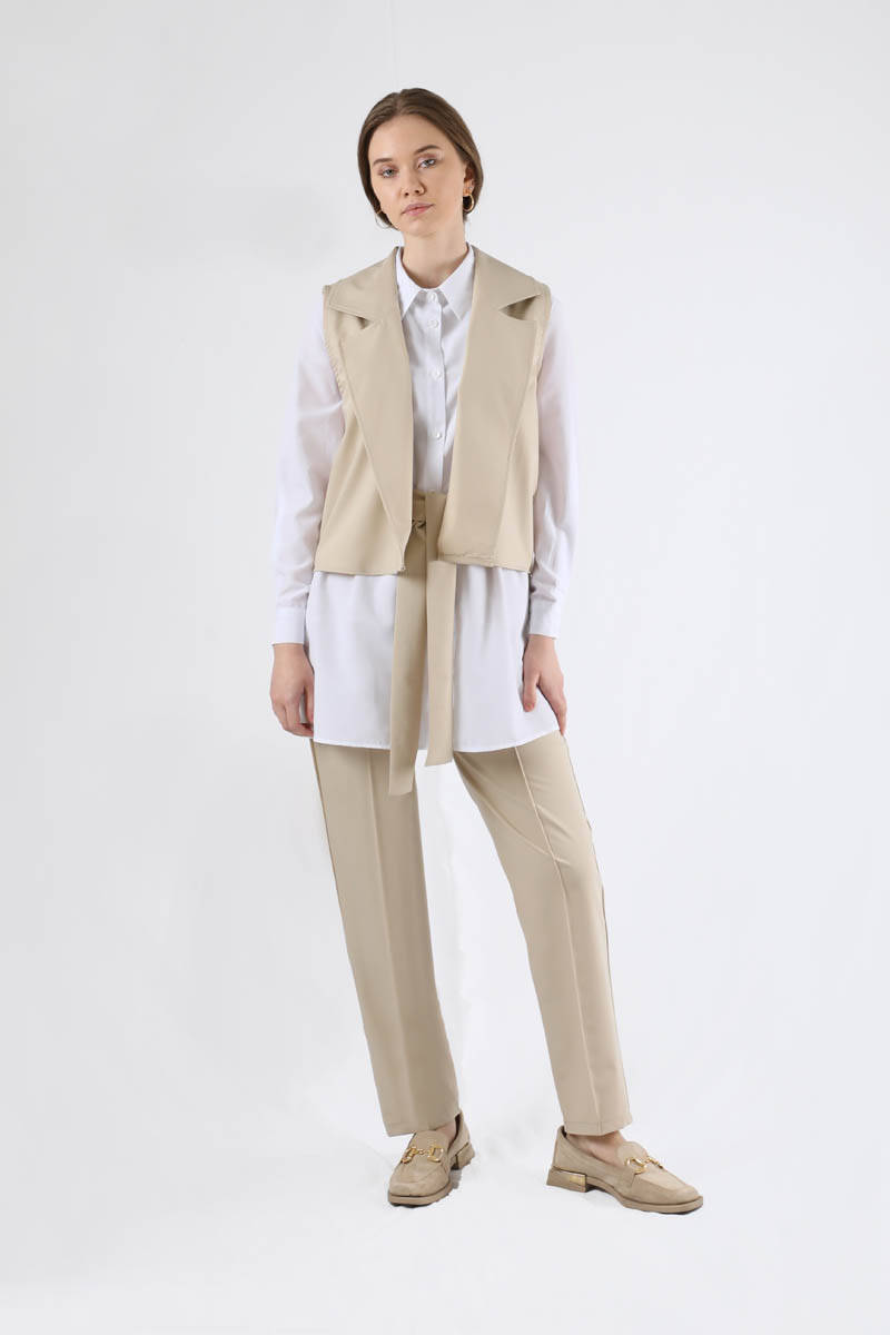 Vest Shirt Suit Cream. Vest is buttoned closure, collar. The front of the trousers is grass. The trousers have elastic waist and have pockets. Shirt belt detail. The shirt is cuffed. You can choose it for your daily use and special occasions.