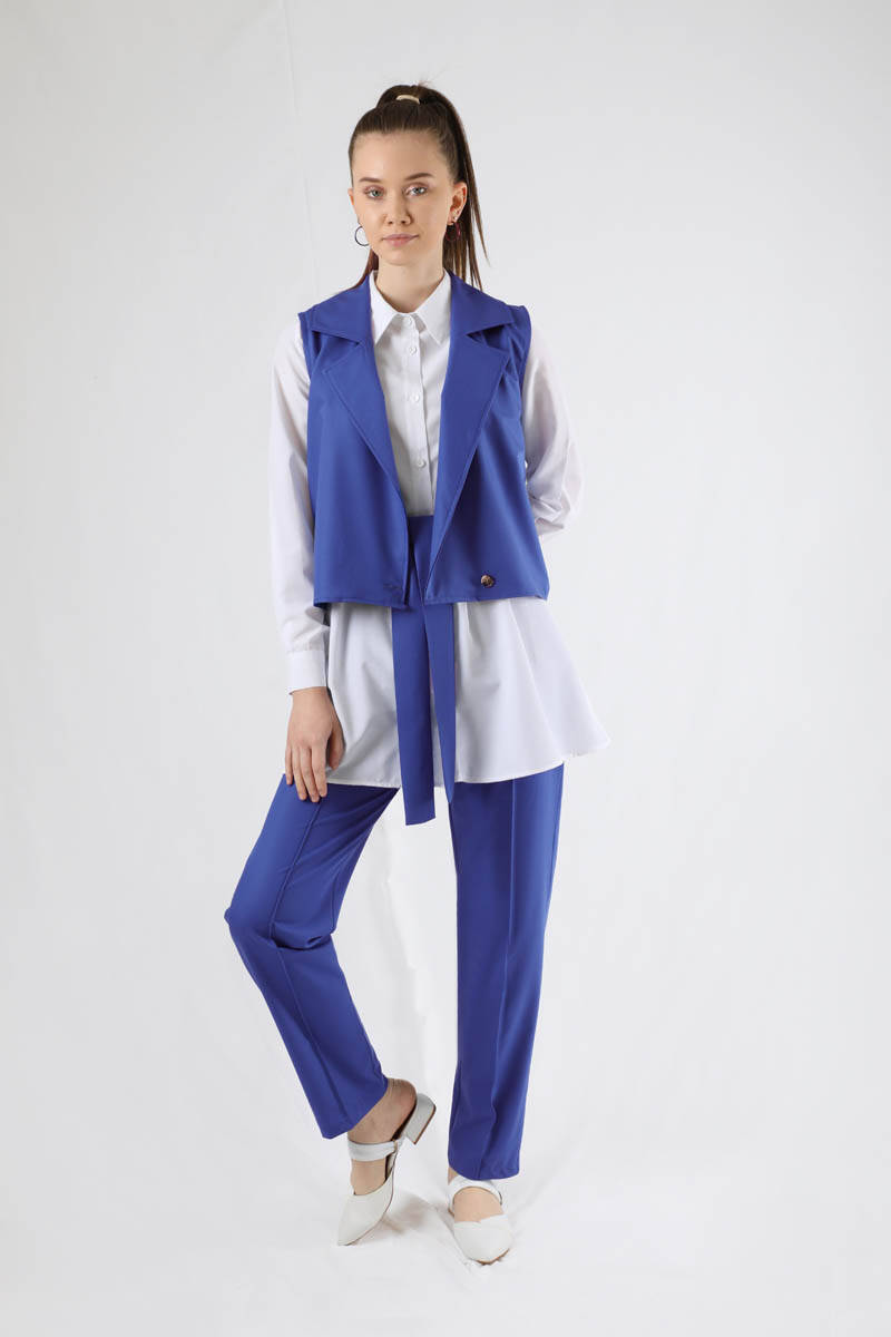 Vest Shirt Suit Indıgo. Vest is buttoned closure, collar. The front of the trousers is grass. The trousers have elastic waist and have pockets. Shirt belt detail. The shirt is cuffed. You can choose it for your daily use and special occasions.