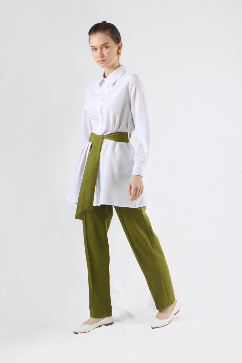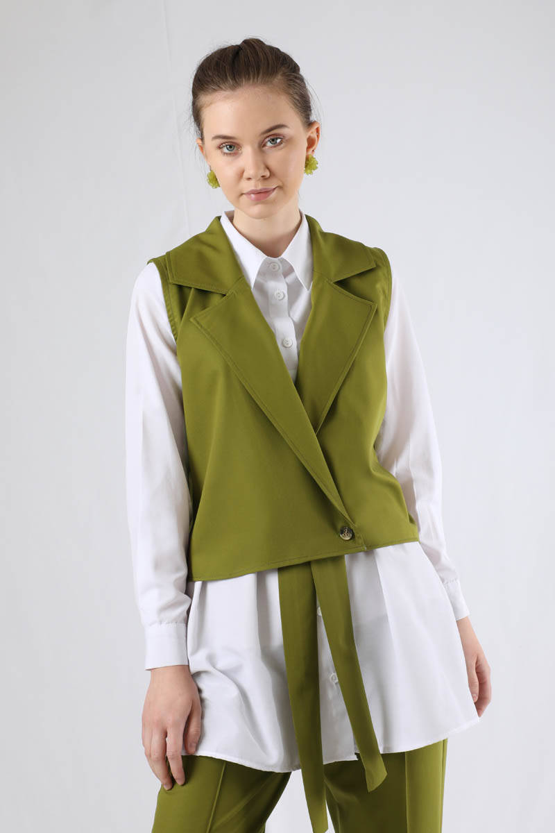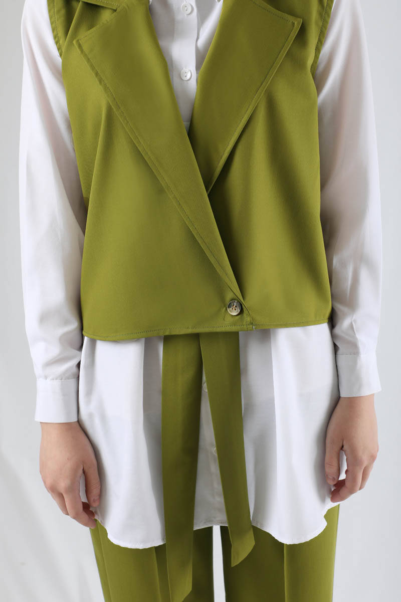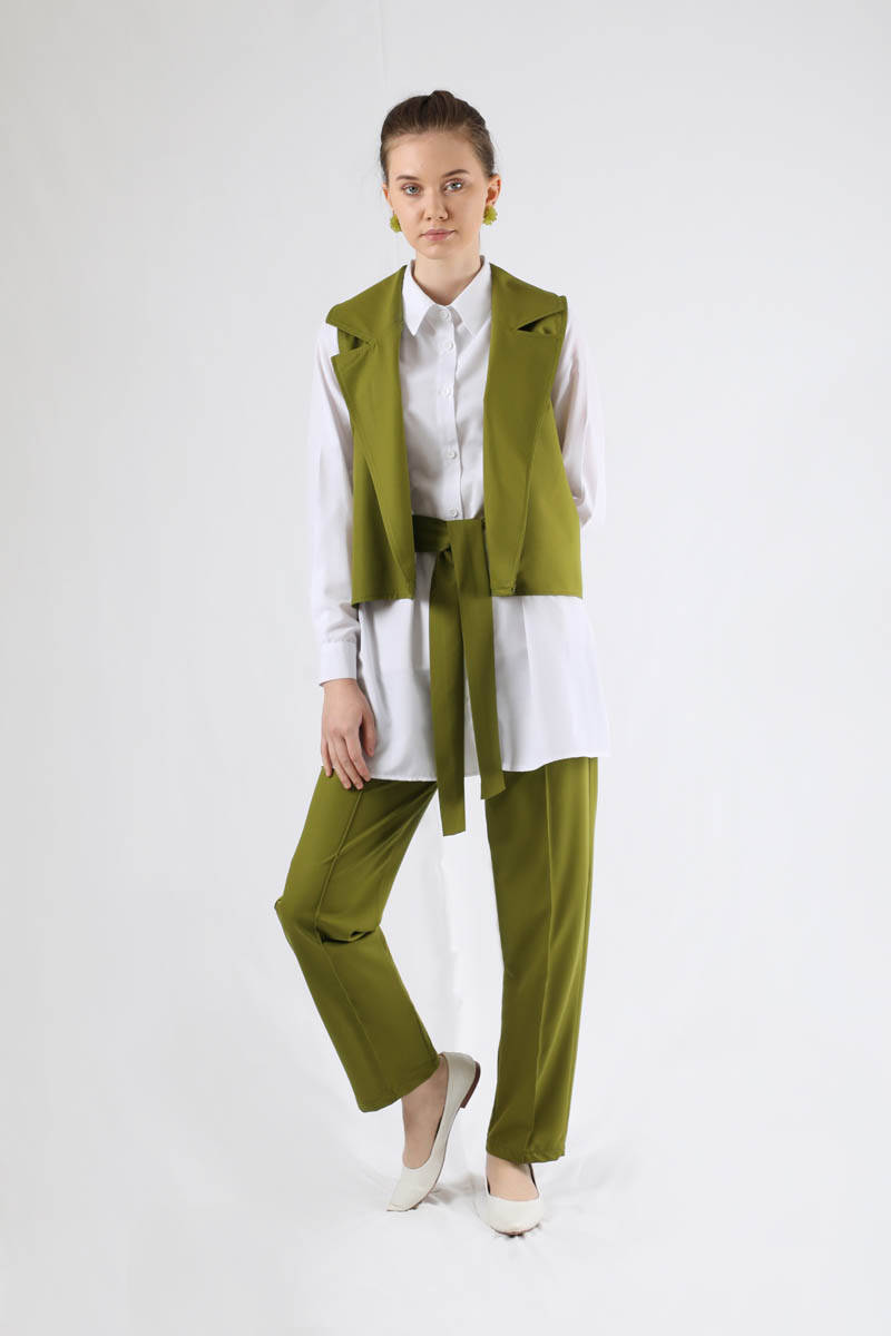 Vest Shirt Suit Oil Green. Vest is buttoned closure, collar. The front of the trousers is grass. The trousers have elastic waist and have pockets. Shirt belt detail. The shirt is cuffed. You can choose it for your daily use and special occasions.