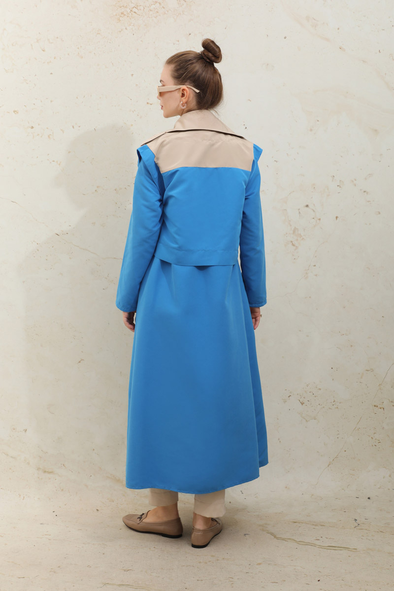 Vest Trench Blue. It has an English collar and a mobile belt. It has a vest. Optional vest and vest can be used separately. The trench coat is belted at the waist and has pocket details. The product is unlined.