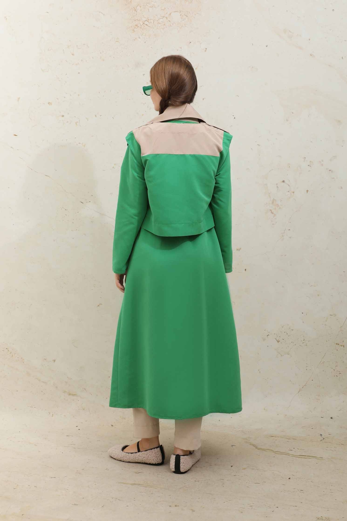 Vest Trench Green. It has an English collar and a mobile belt. It has a vest. Optional vest and vest can be used separately. The trench coat is belted at the waist and has pocket details. The product is unlined.