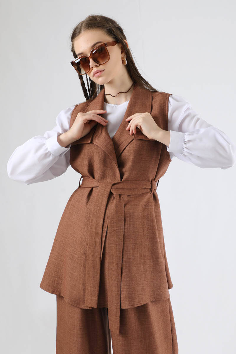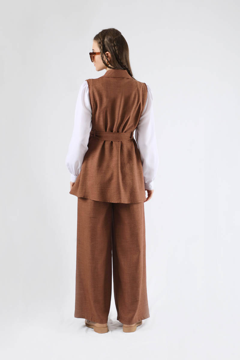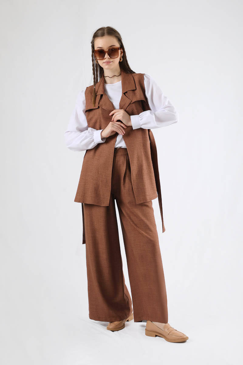 Vest Triple Suit Brown. Vest, shirt, trousers are sold as a set of 3. The vest is unlined. It is windy. The shirt has a Cycling Collar. Balloon sleeves. Cuff closure button. The shirt is detailed with a drop button on the back. The waist of the trousers is elastic. it is pleated. has pockets. it is abundant. You can choose it for your daily use and special occasions.