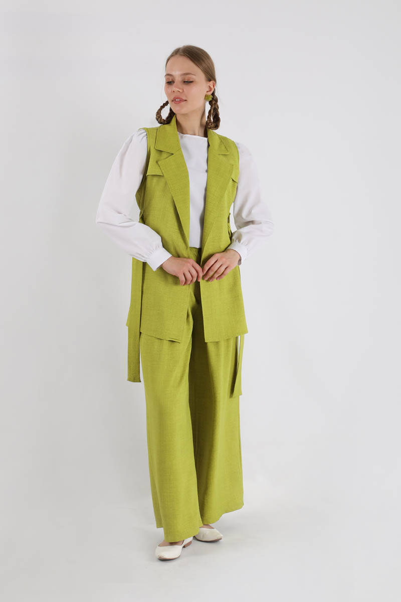Vest Triple Suit Oil Green. Vest, shirt, trousers are sold as a set of 3. The vest is unlined. It is windy. The shirt has a Cycling Collar. Balloon sleeves. Cuff closure button. The shirt is detailed with a drop button on the back. The waist of the trousers is elastic. it is pleated. has pockets. it is abundant. You can choose it for your daily use and special occasions.