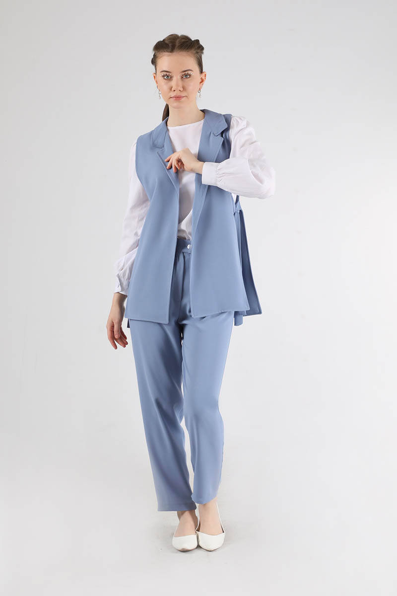Vest Tunic Suit Baby Blue, pockets are active, Vest should be tied at the side. It has side pockets. It is full mold. It is sold as a set of three as shirt, vest and trousers.