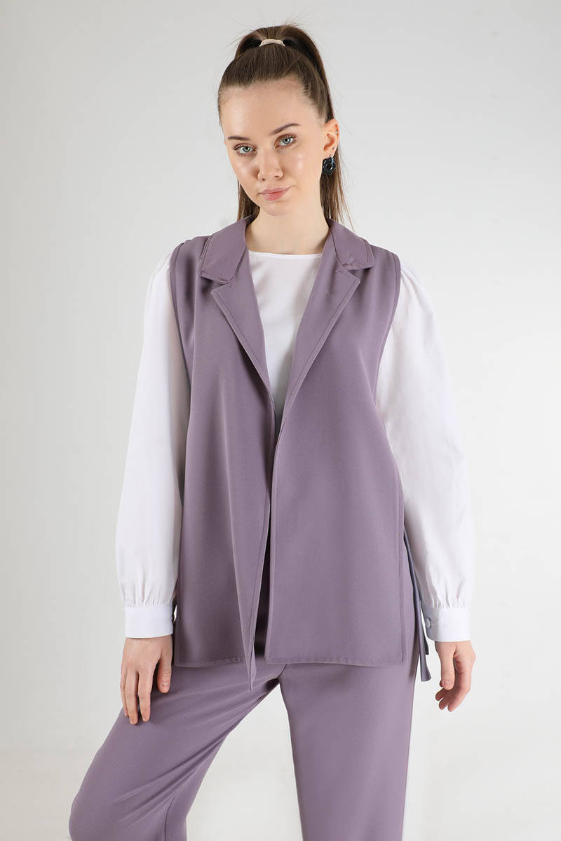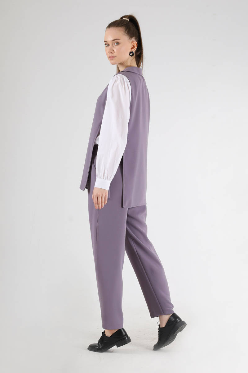Vest Tunic Suit Dark Lilac, pockets are active, Vest should be tied at the side. It has side pockets. It is full mold. It is sold as a set of three as shirt, vest and trousers.
