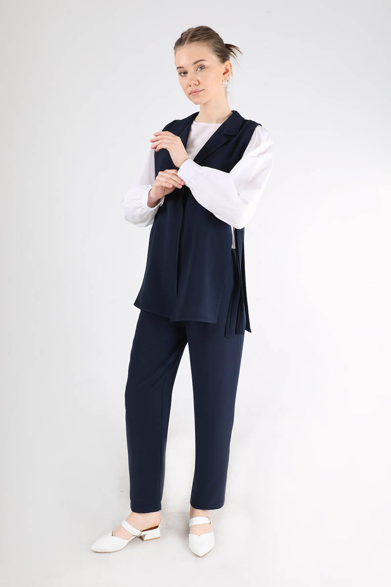 Vest Tunic Suit Navy Blue, pockets are active, Vest should be tied at the side. It has side pockets. It is full mold. It is sold as a set of three as shirt, vest and trousers.
