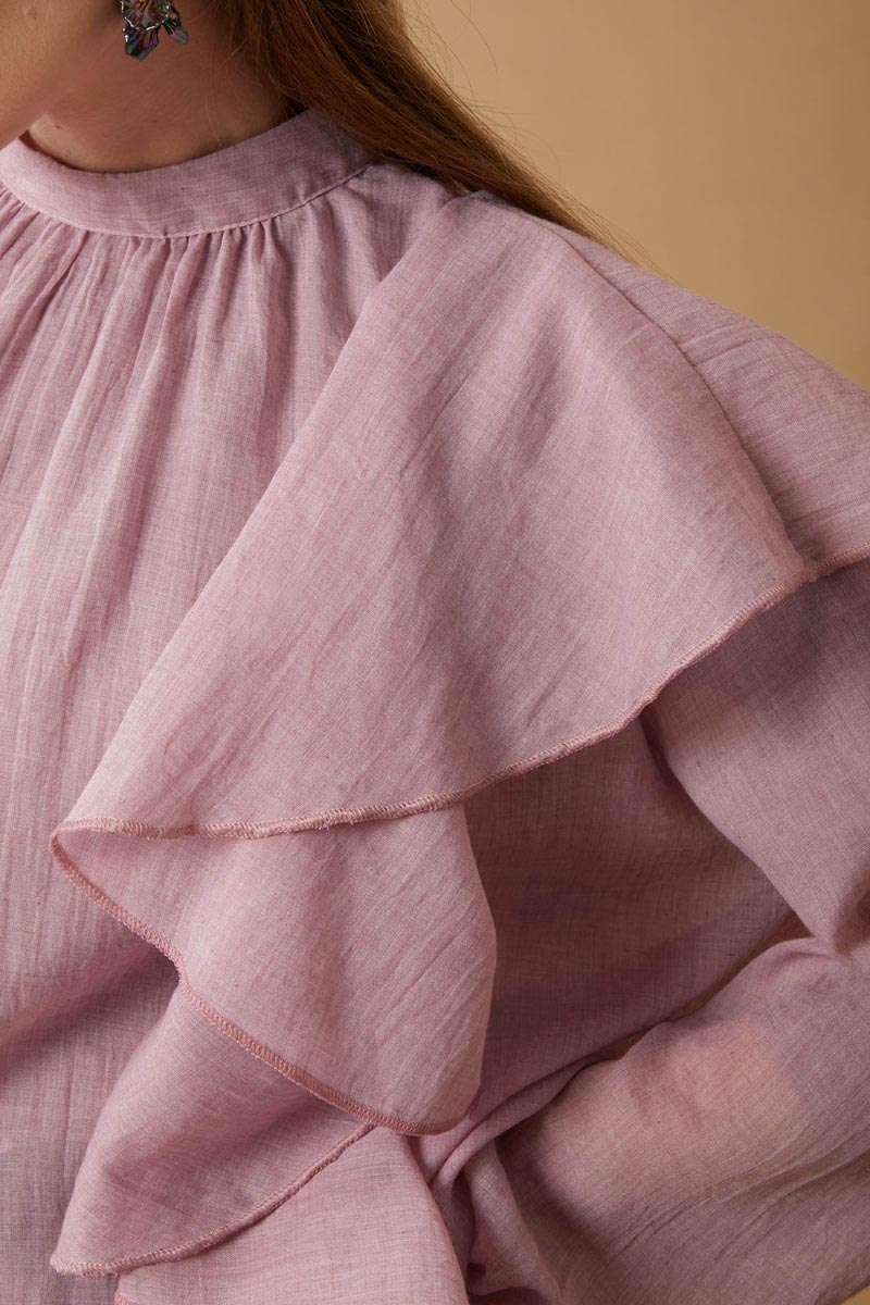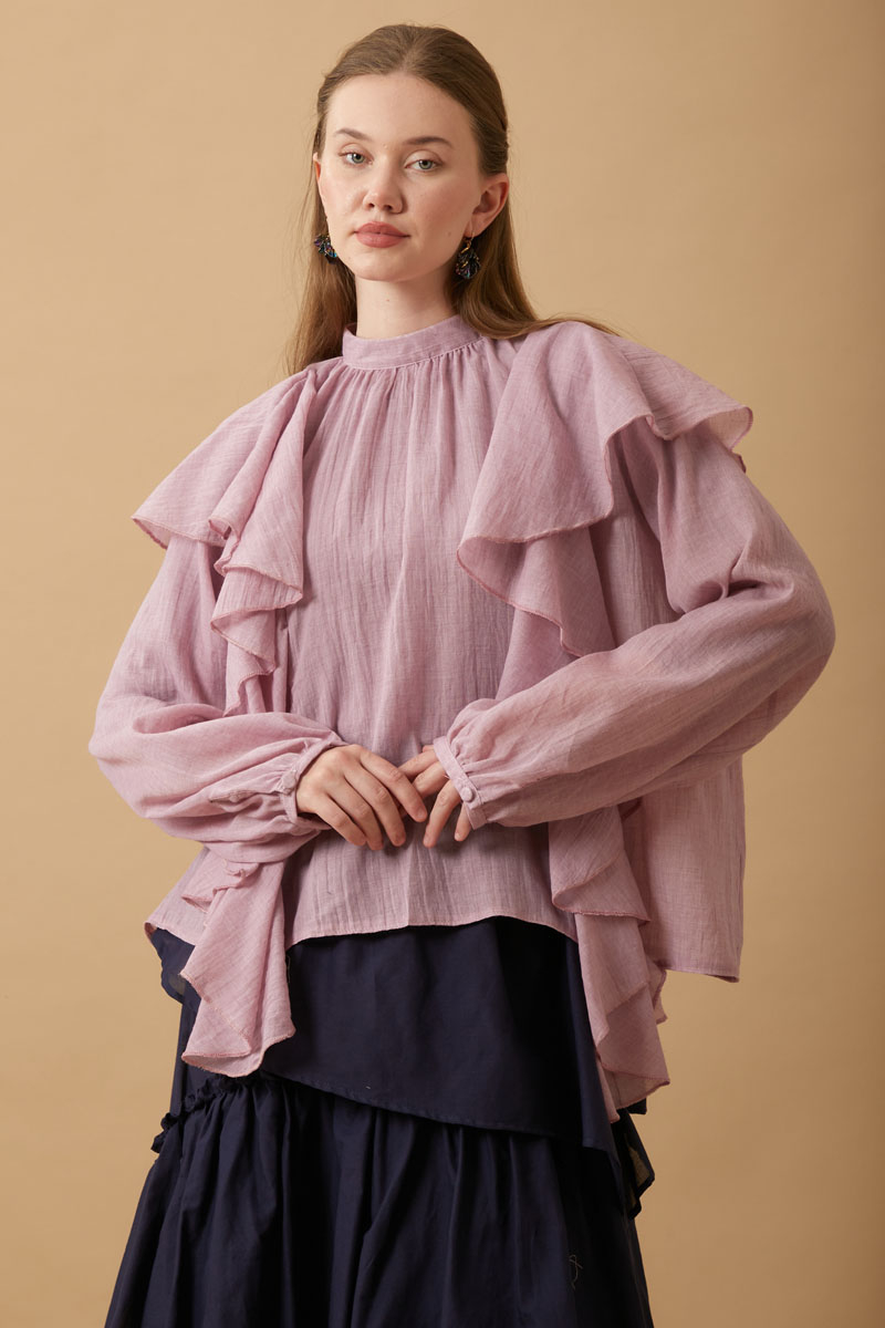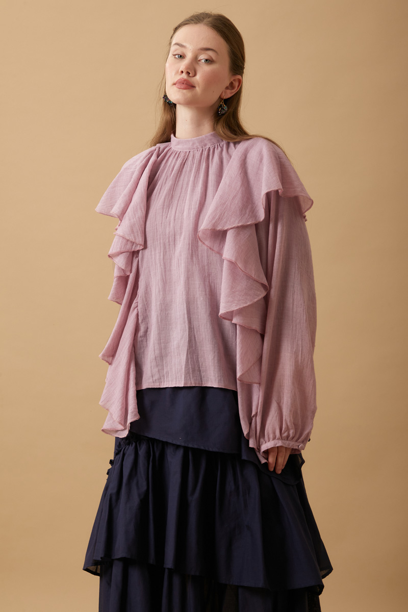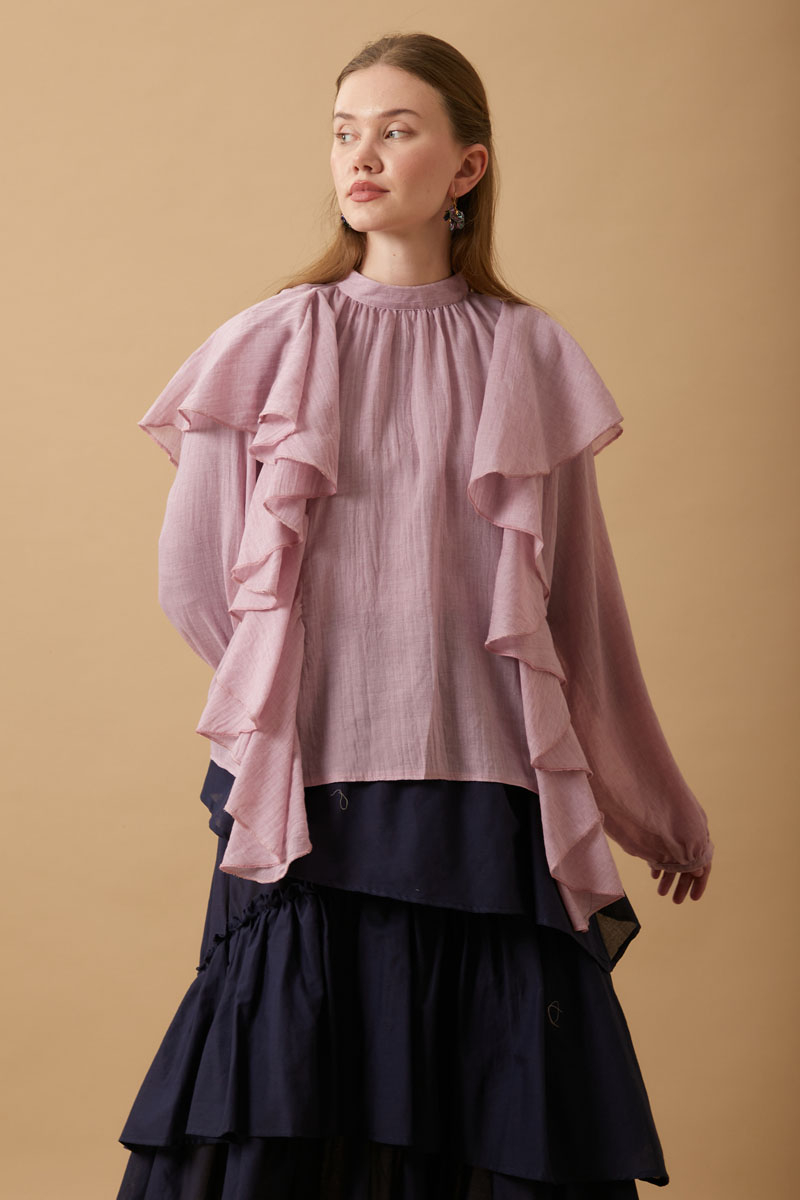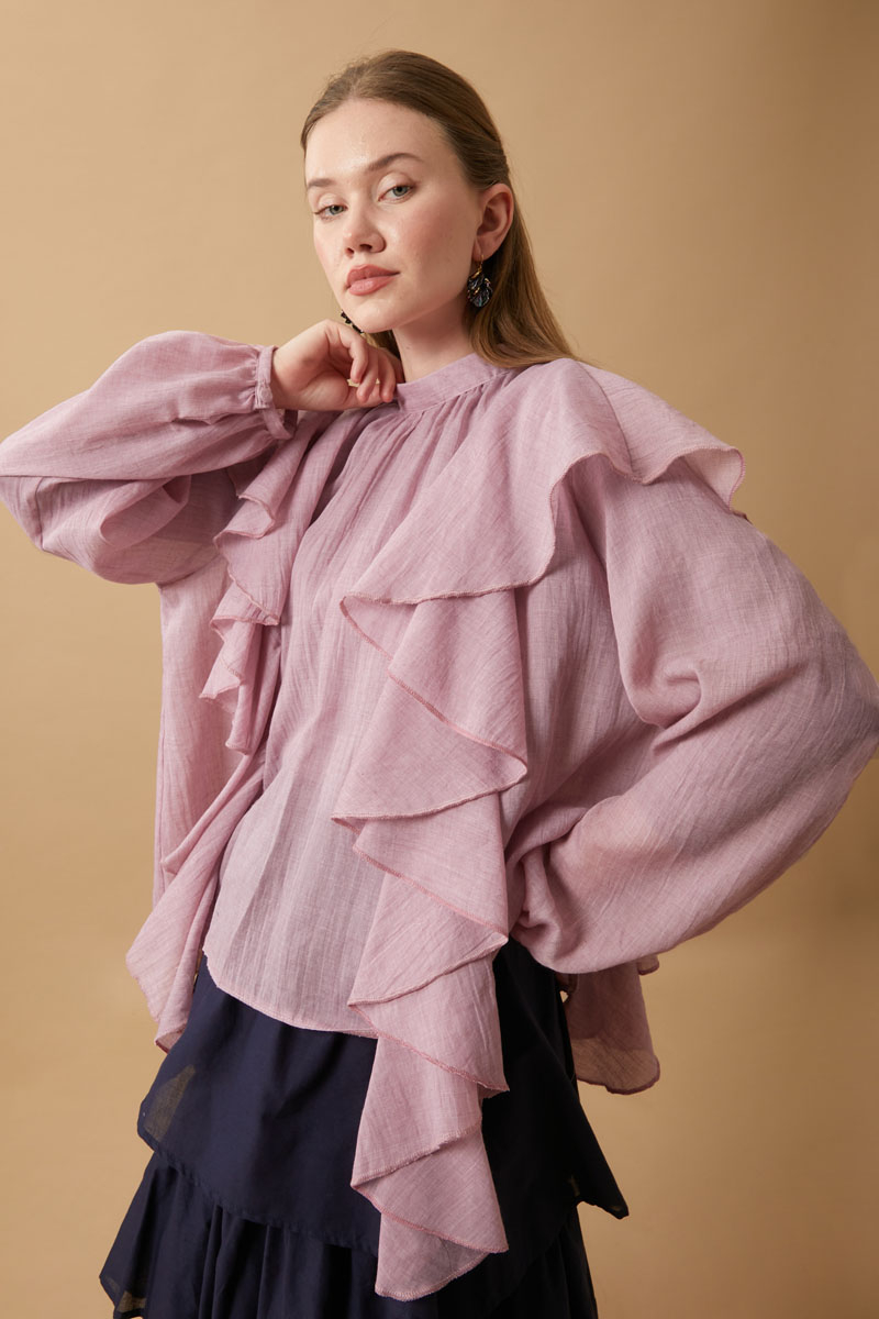 Volanlı Bluz Pudra, hafif ve nefes alabilen dokusuyla gün boyu konfor sunar. Kumaşın yapısından dolayı iç göstermektedir. Pamuklu Uzun Kollu İçlik ile kombinlenebilir.