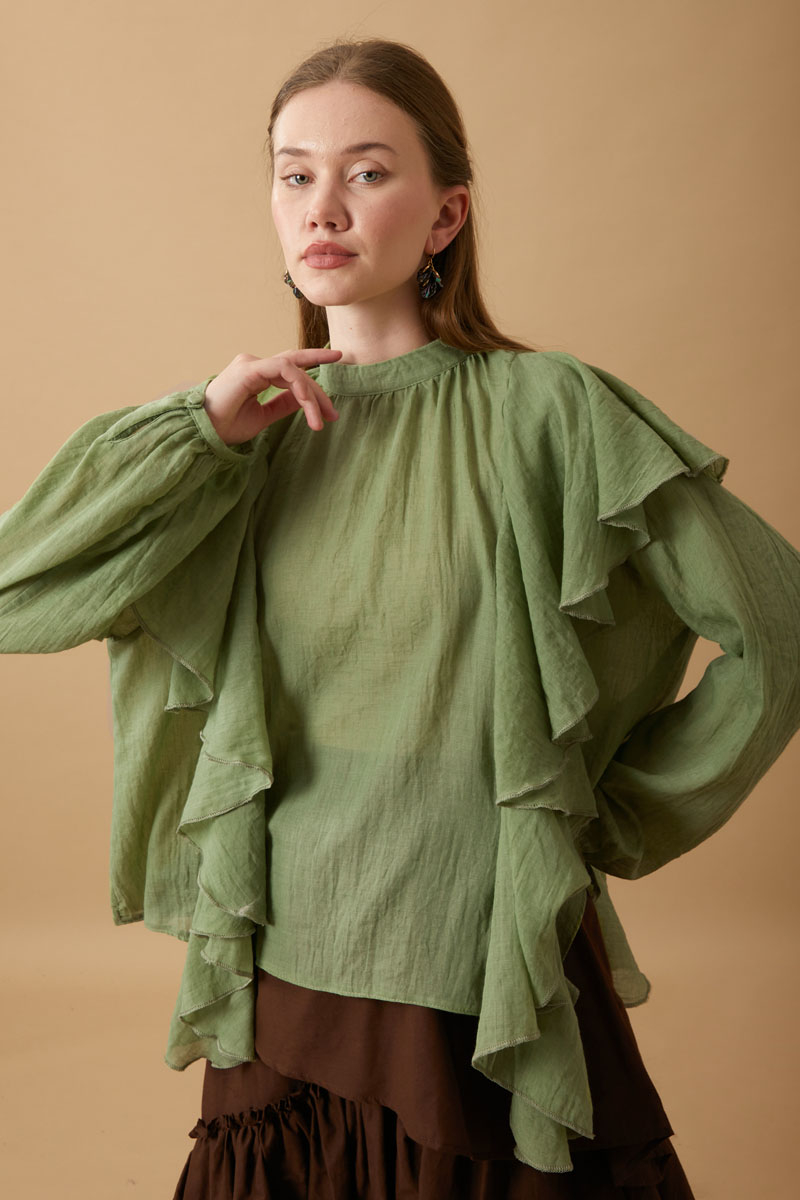 Volanlı Bluz Soft Yeşil, hafif ve nefes alabilen dokusuyla gün boyu konfor sunar. Kumaşın yapısından dolayı iç göstermektedir. Pamuklu Uzun Kollu İçlik ile kombinlenebilir.