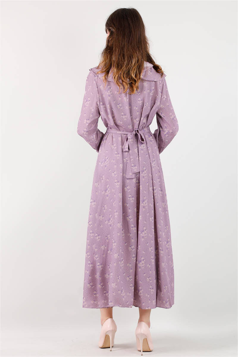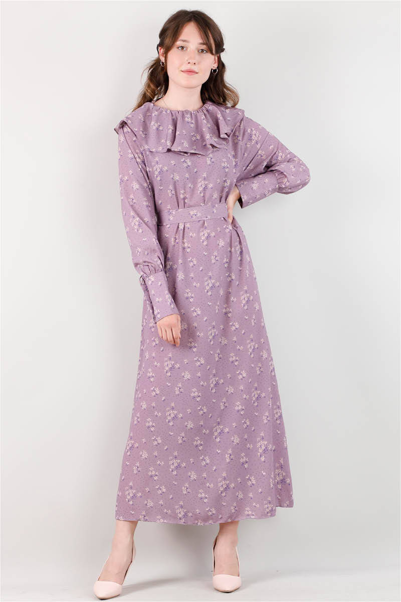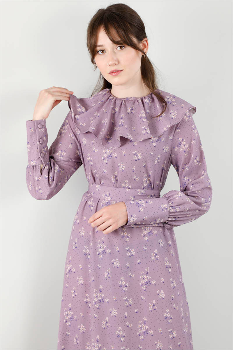 Volanlı Büzgülü Yaka Elbise Lila