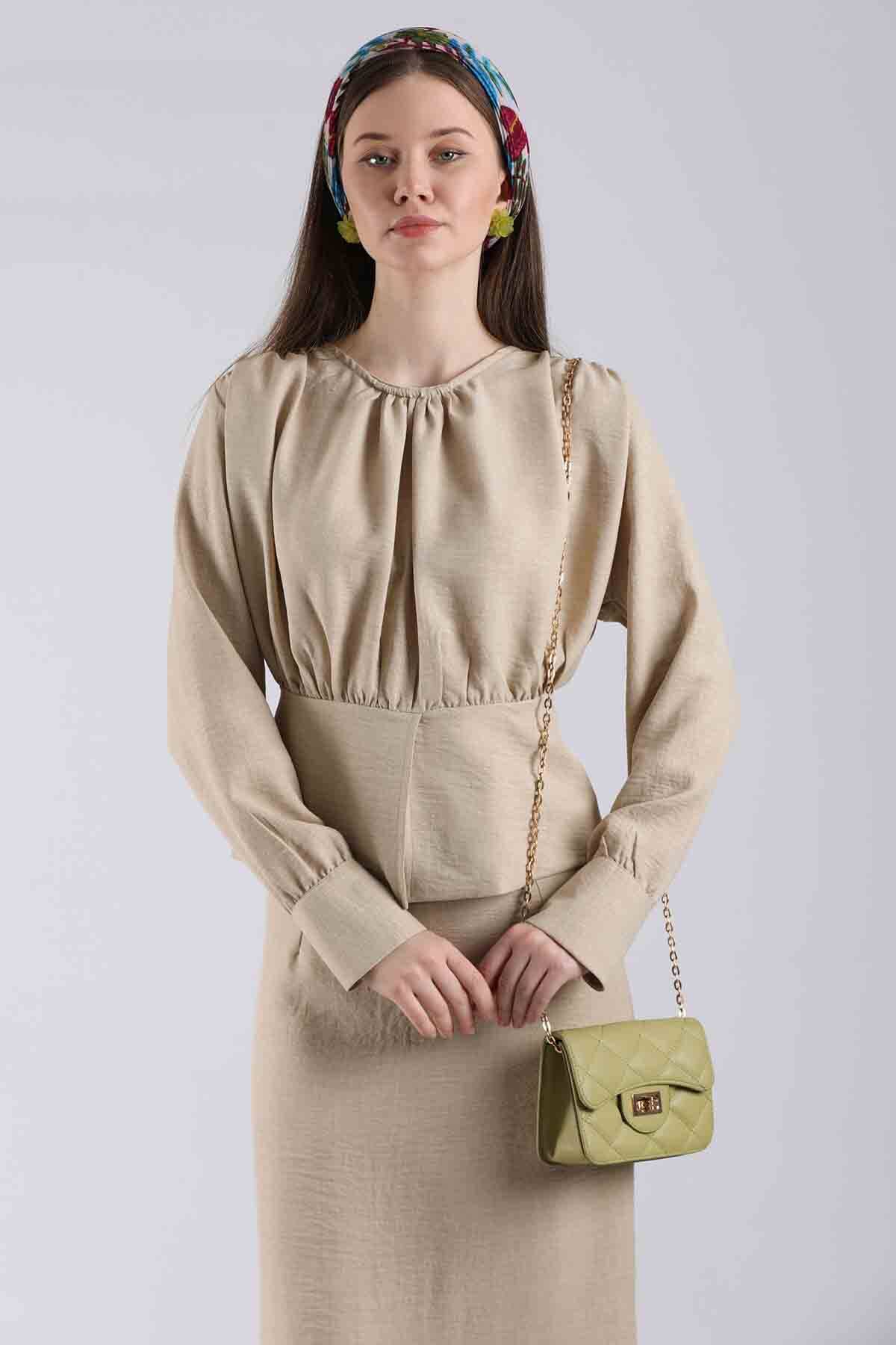 Volanlı Etek Takım Taş. Volan detaylı olarak üretilen bu ürün yeni sezonun en gözde modellerindendir. Etek ile takım olarak satılmaktadır.