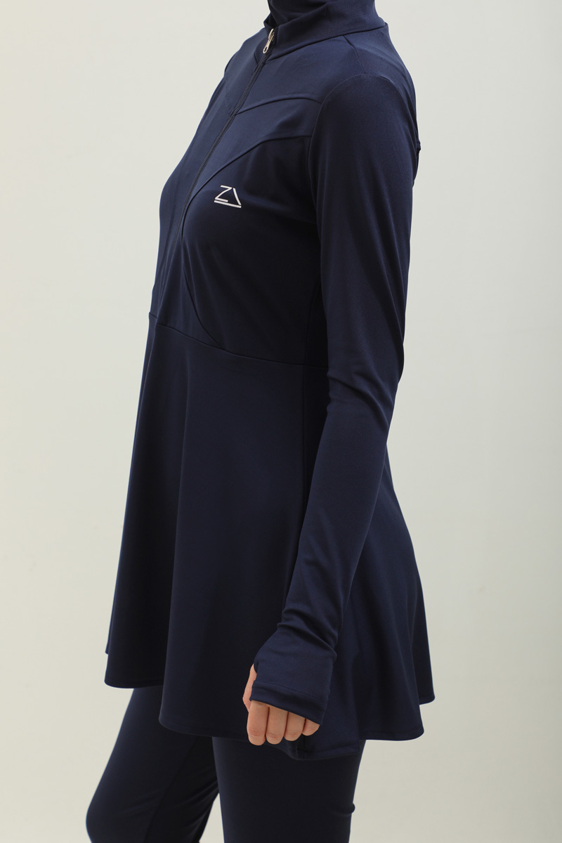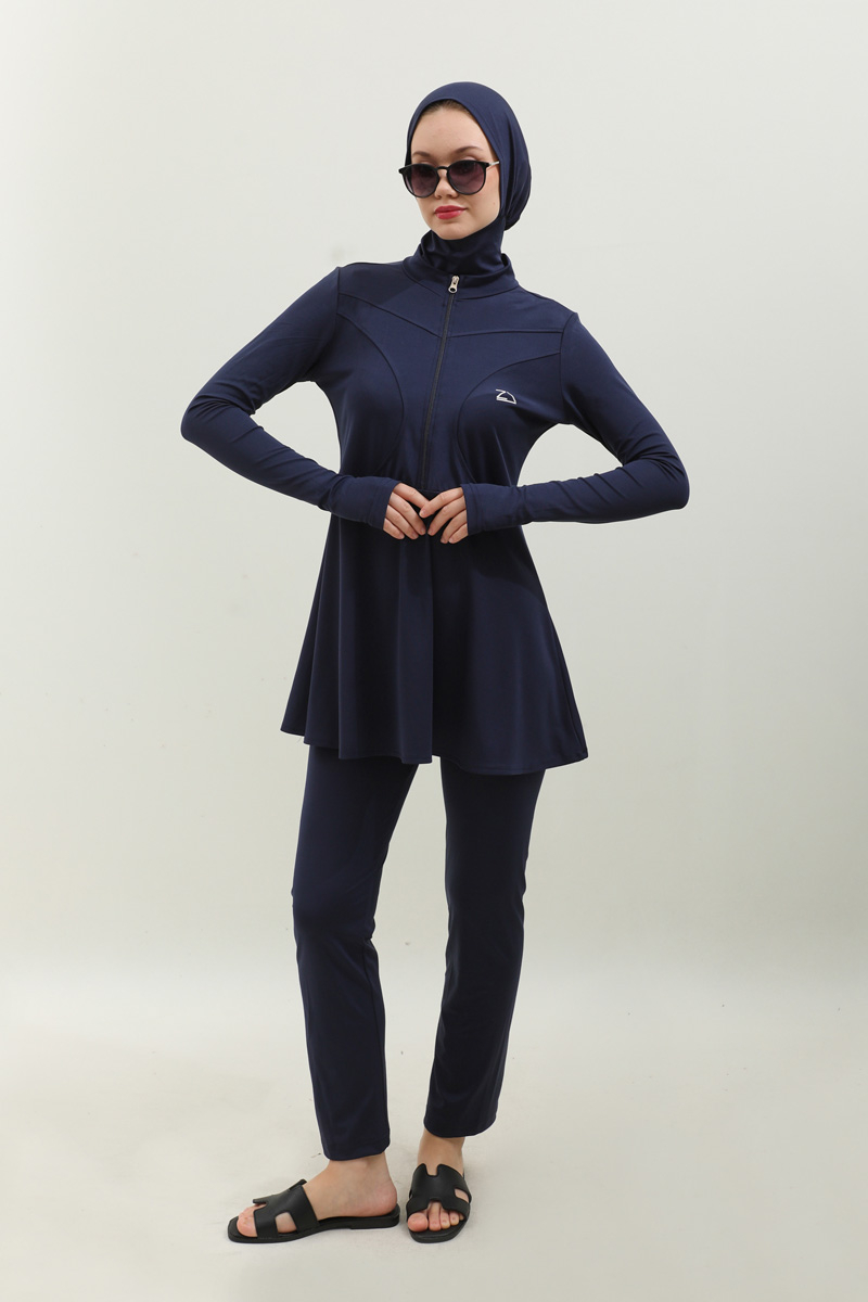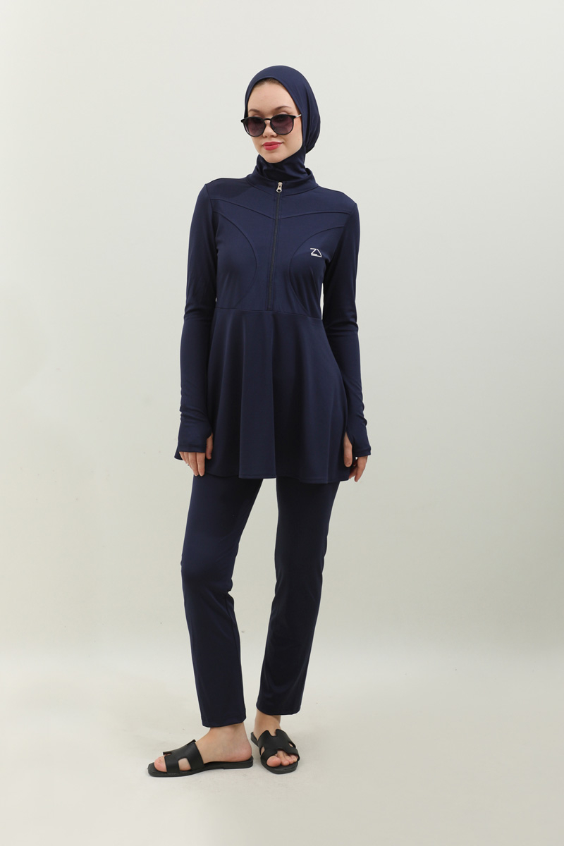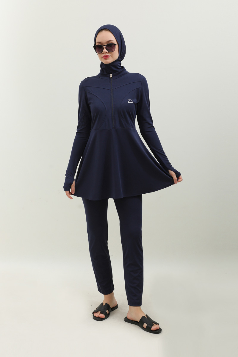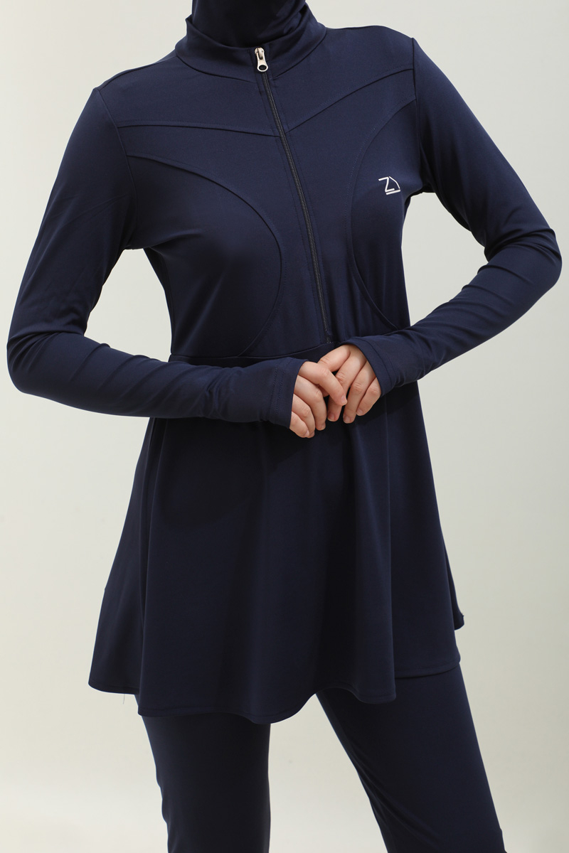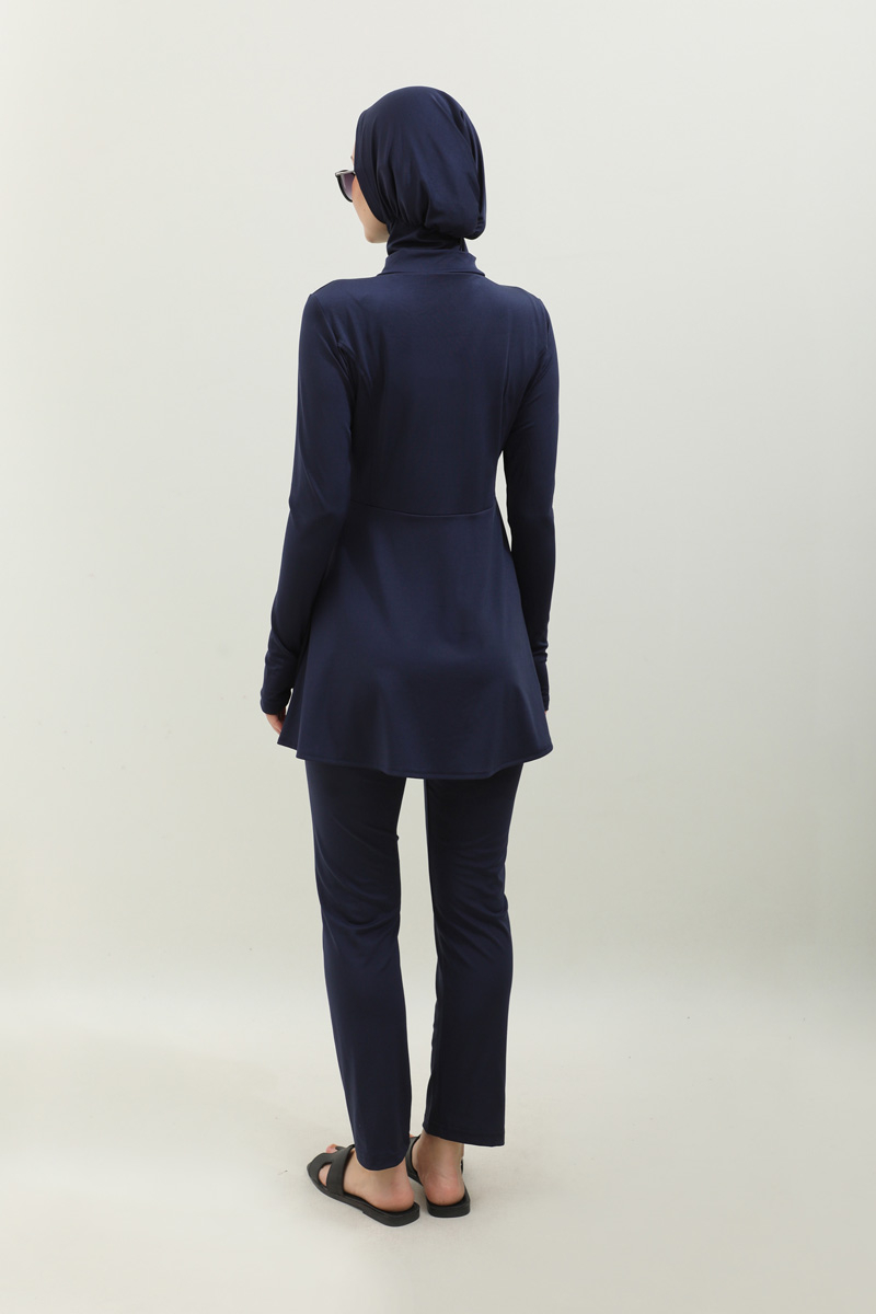Volanlı Tesettür Mayo Takım Lacivert. Hakim yakalıdır, önden yarım fermuarlıdır, bilek kısmı parmak geçirme detaylıdır, eteği kloştur, tayt beli lastiklidir, düz paçalıdır. Paket İçeriği:Tayt, üst tunik ve bonesi takım olarak satılmaktadır. (Şapka takıma dahil değildir.)