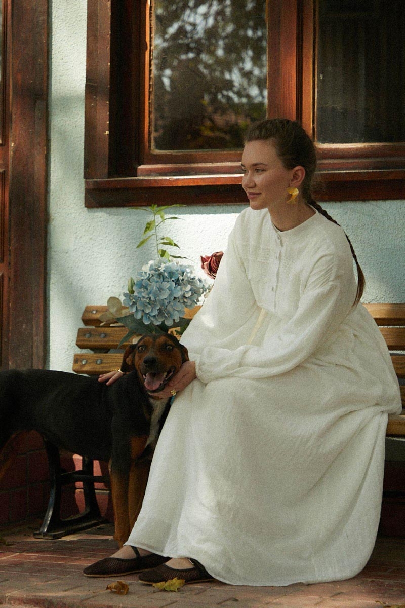 Offers a natural and timeless elegance, while its lightweight and breathable fabric ensures comfortable wear from summer through autumn. The lace details on the chest and pleated silhouette add a romantic, vintage touch, while its loose fit allows freedom of movement. With long sleeves featuring wide cuffs, it can be effortlessly styled for both casual and special occasions.