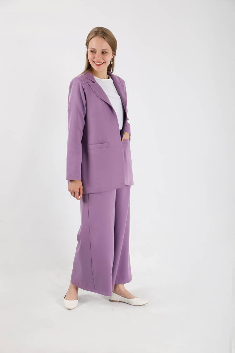 Wide Leg Pants Jacket Set Lilac. The jacket is lined. The trousers are elastic at the back, have pockets, have wide legs, are buttoned. You can choose it for your daily use and special occasions.