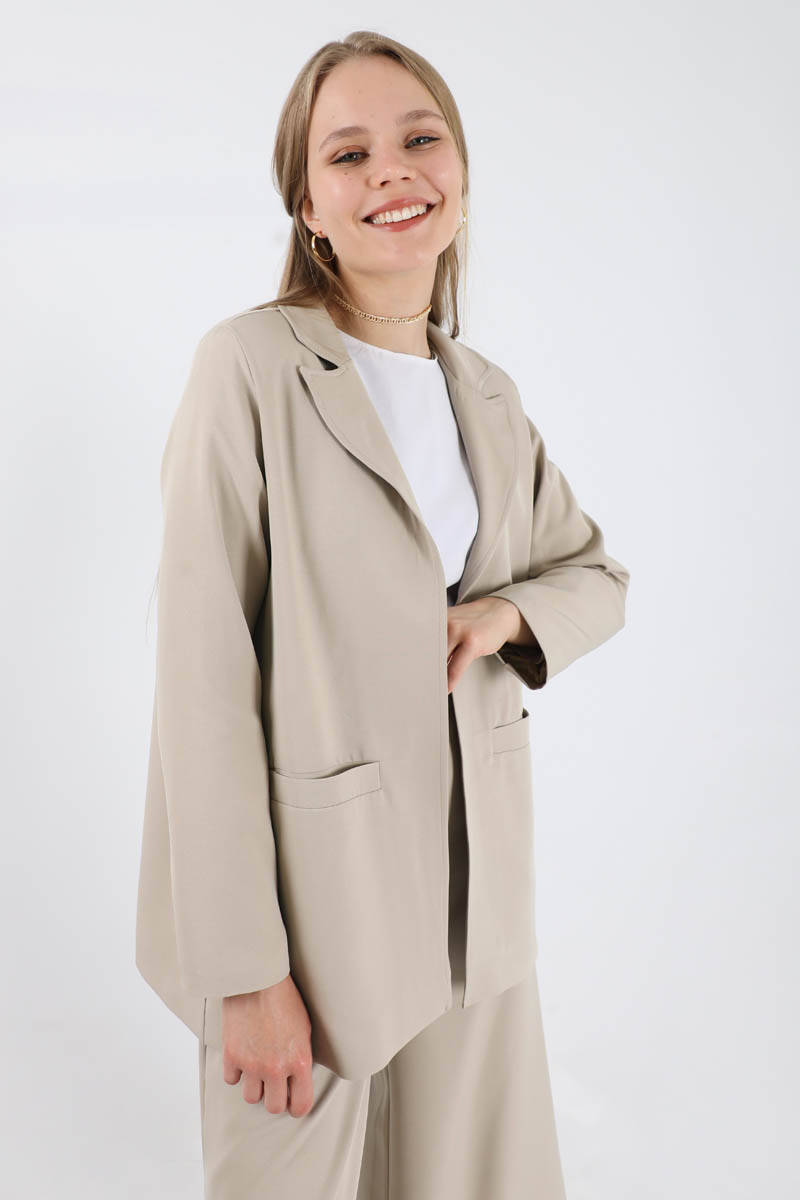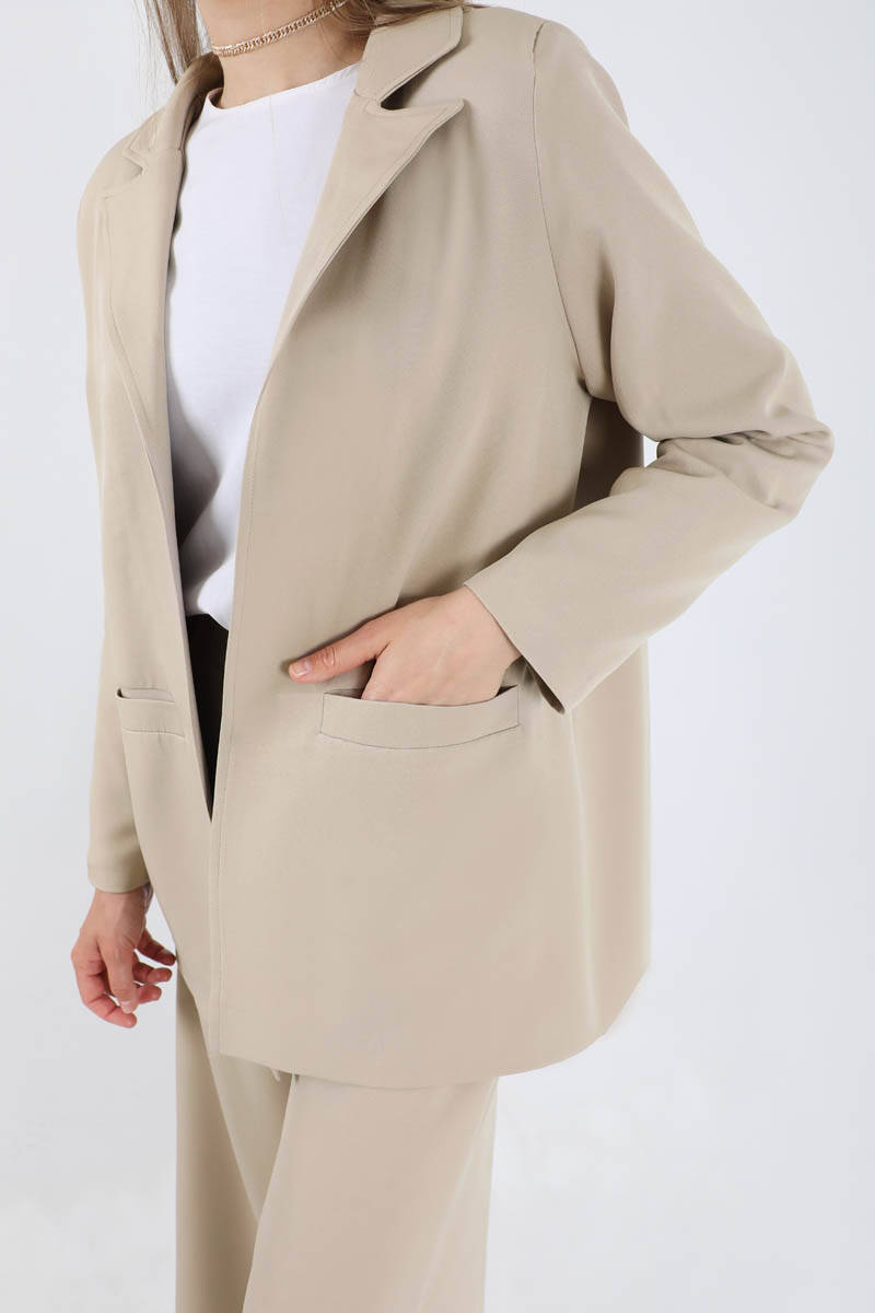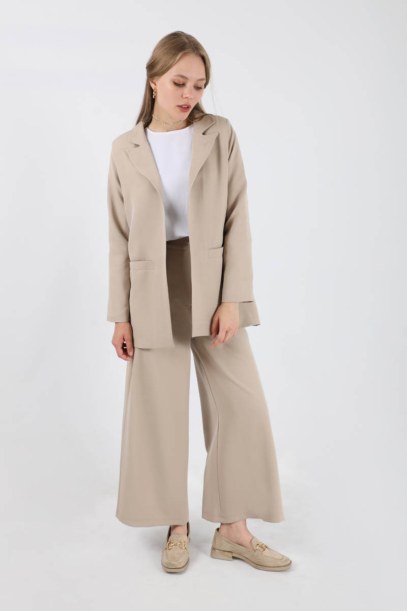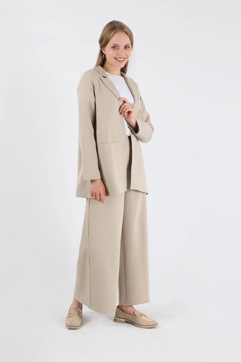 Wide Leg Pants Jacket Set Stone. The jacket is lined. The trousers are elastic at the back, have pockets, have wide legs, are buttoned. You can choose it for your daily use and special occasions.