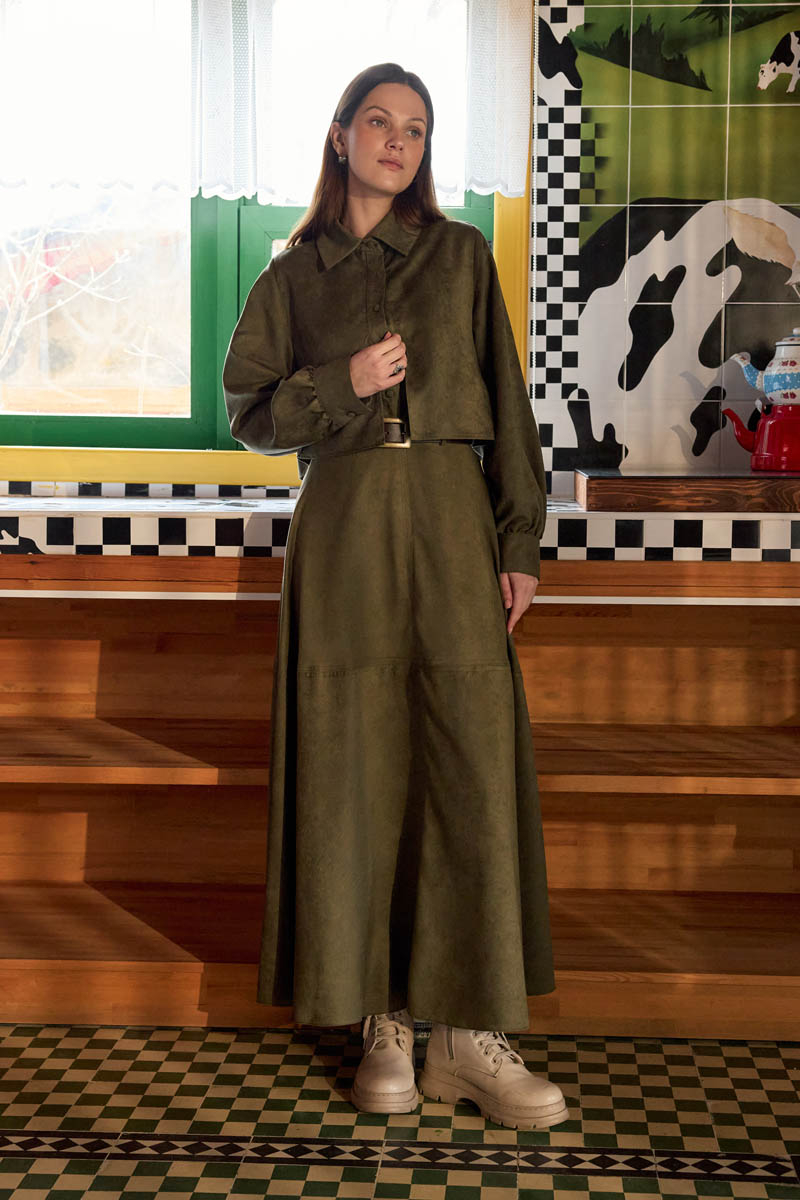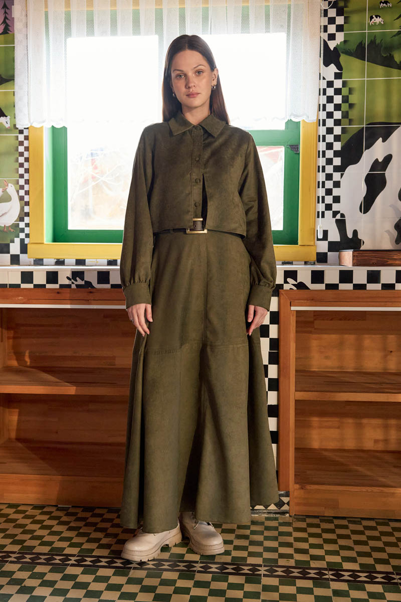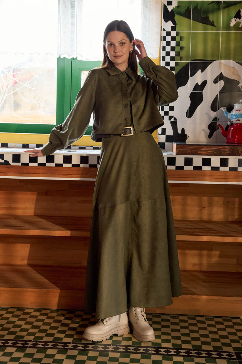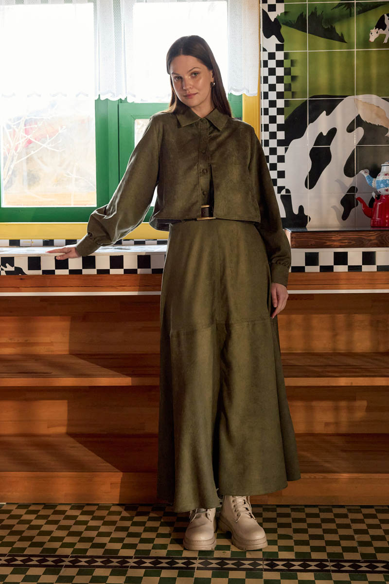 Wind Flap Suede Shirt Khaki offers a strong, vintage-inspired silhouette with its soft suede texture and cropped length. The wind flap detail on the front panel adds character to the design, while the classic shirt collar provides a balanced and timeless look. Thanks to its short cut, it creates an ideal proportion when styled with high-waisted skirts and trousers. Its firm yet soft fabric maintains its shape, and with its clean, structured lines, it can be comfortably worn in both everyday city style and more refined combinations. Suitable for solo wear or layered outfits during the autumn–winter season.