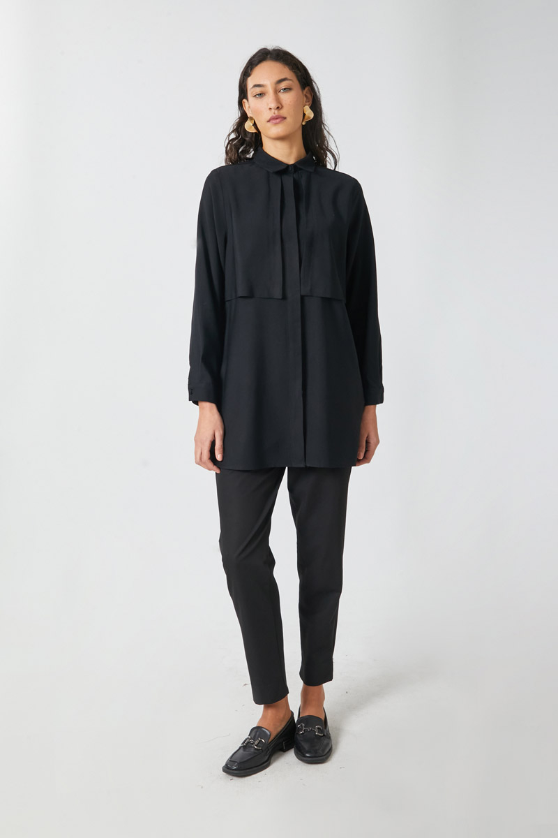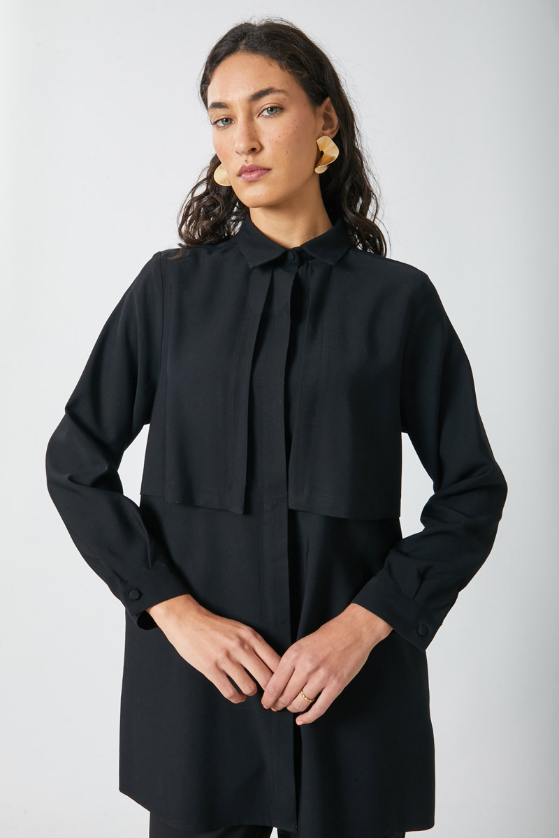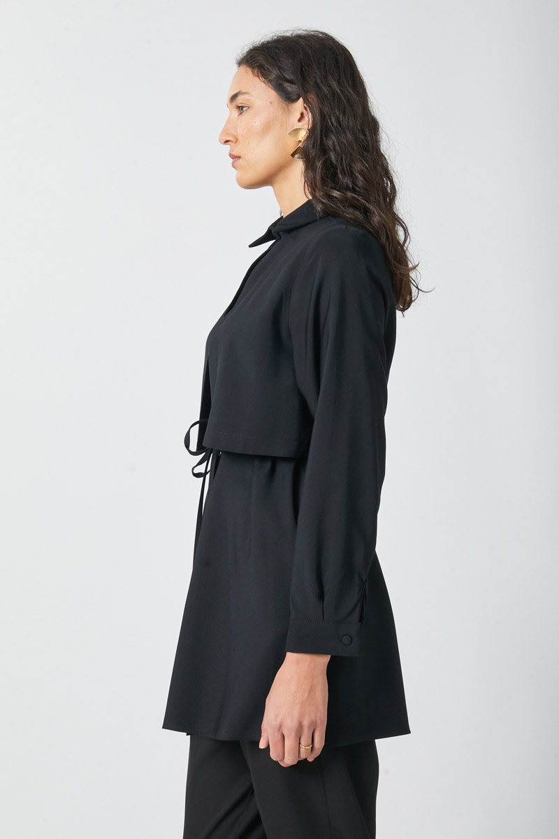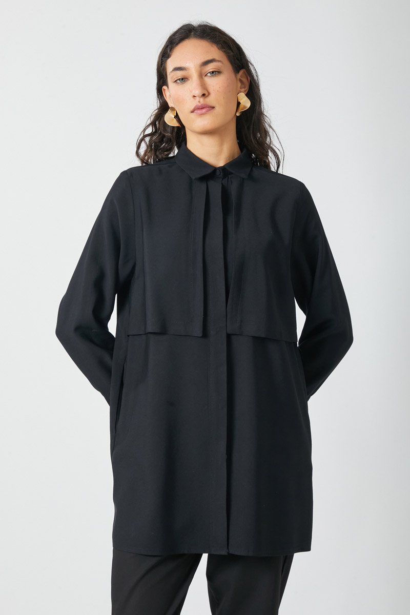 Windbreaker Detail Tencel Shirt Black. Features a classic shirt collar, front button closure, wind flap detail, piping belt, and cuffed sleeves. Ideal for both daily wear and special occasions.