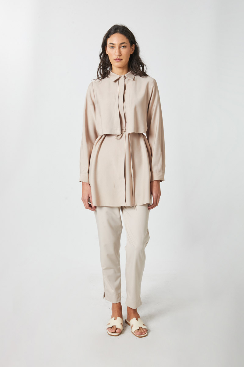 Windbreaker Detail Tencel Shirt Black. Features a classic shirt collar, front button closure, wind flap detail, piping belt, and cuffed sleeves. Ideal for both daily wear and special occasions.