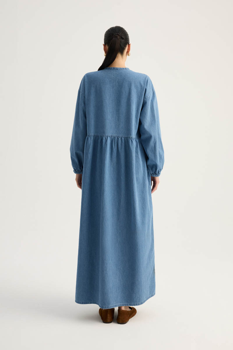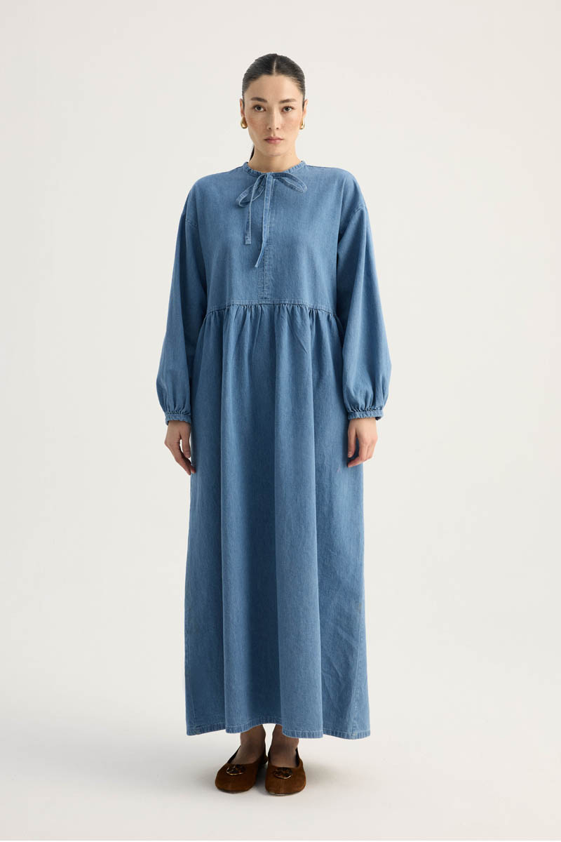 Yakadan Bağlamalı Denim Elbise Mavi
