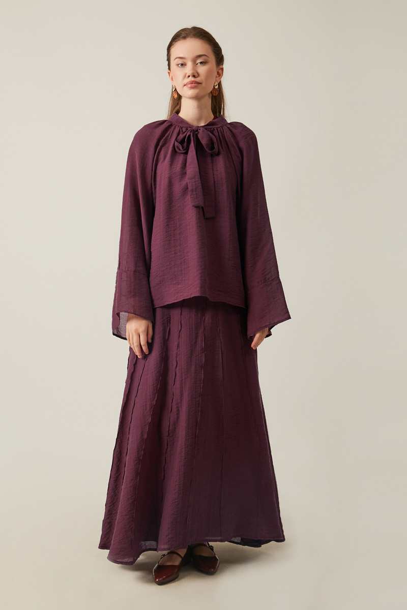 Yakası Bağcıklı Etek Takım Bordo. üst parçadaki bol kesimli bluz, bağlamalı yaka detayı ve geniş kollarıyla modern ve rahat bir silüet çizerken, alt kısımdaki uzun etek, akıcı dökümü ve dikey panel detaylarıyla zarif bir hareketlilik katıyor.