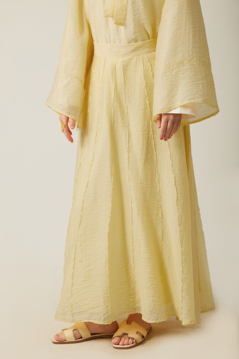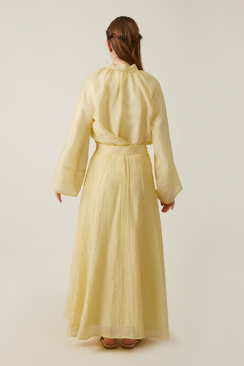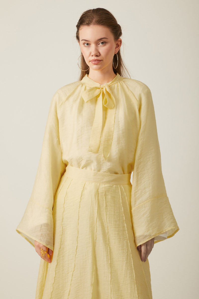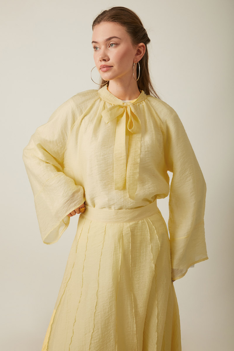 Yakası Bağcıklı Etek Takım Tereyağı Sarısı. üst parçadaki bol kesimli bluz, bağlamalı yaka detayı ve geniş kollarıyla modern ve rahat bir silüet çizerken, alt kısımdaki uzun etek, akıcı dökümü ve dikey panel detaylarıyla zarif bir hareketlilik katıyor.