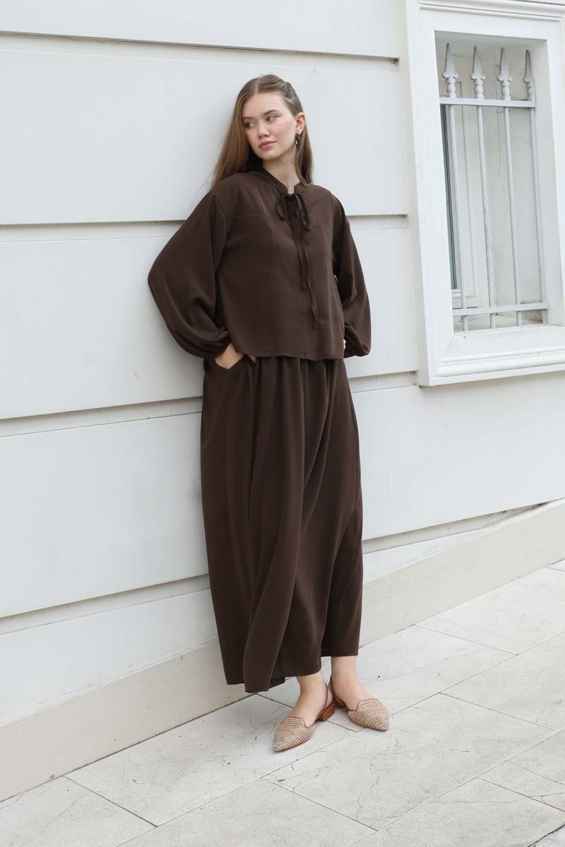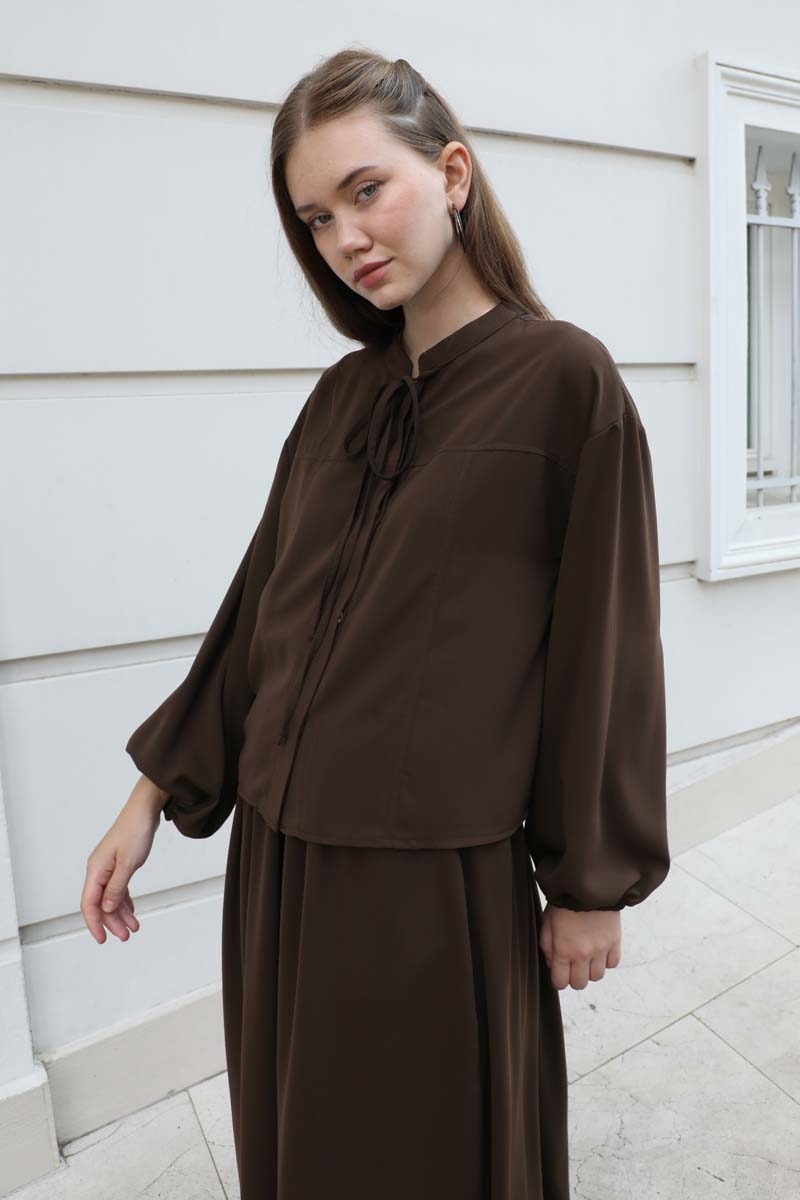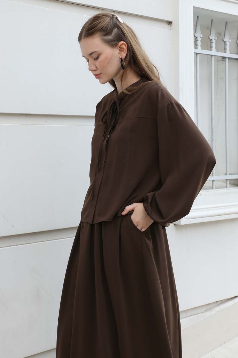 Yakası Bağcıklı Gömlek Etek Takım Acı Kahve