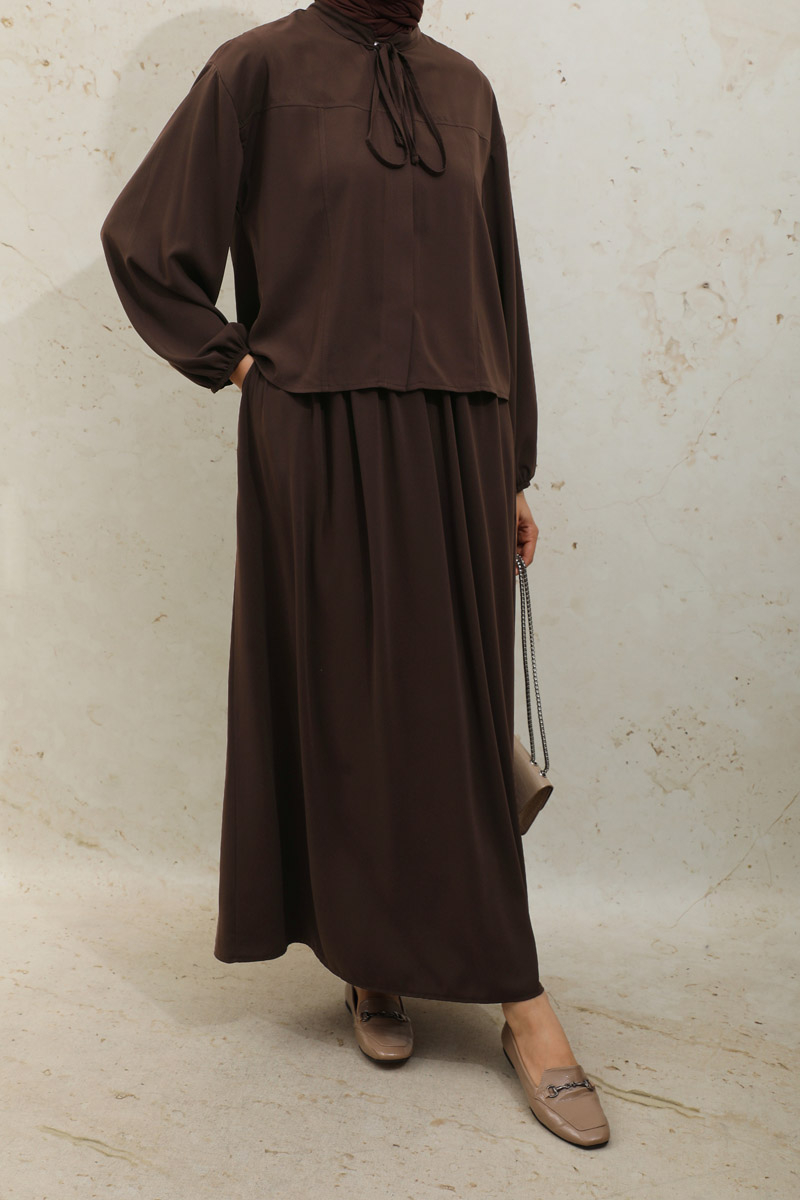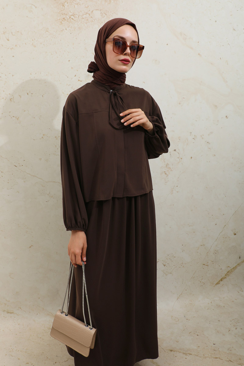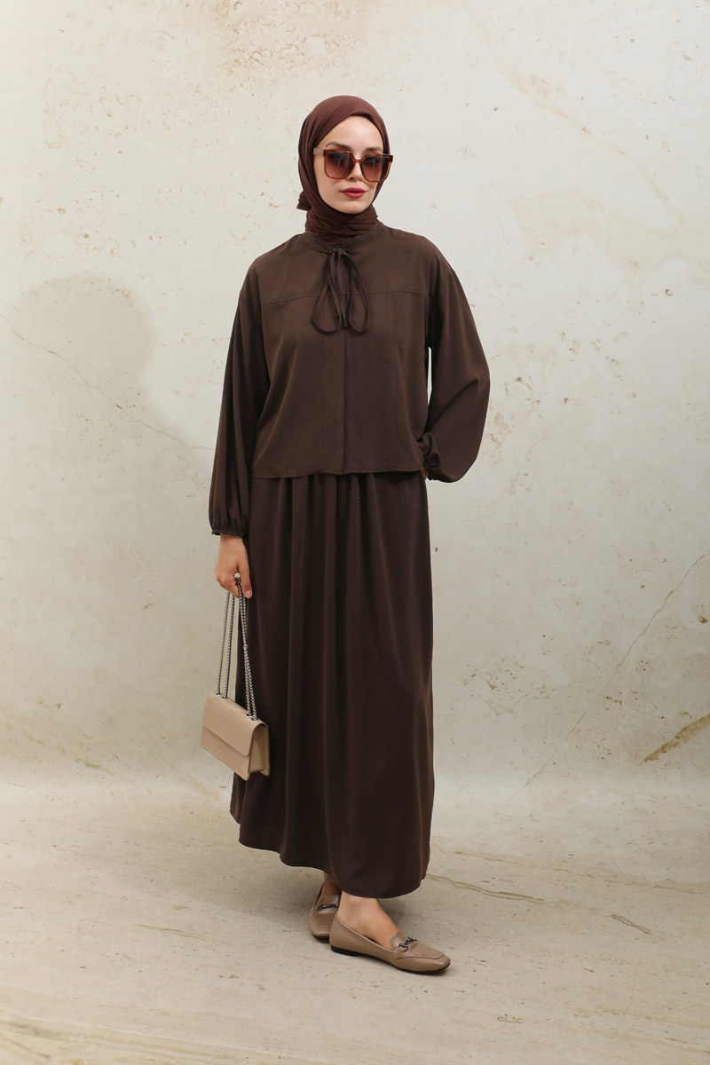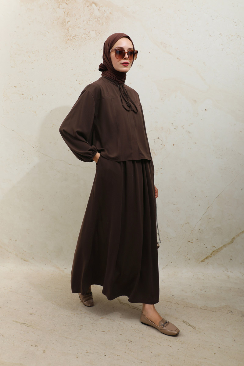 Yakası Bağcıklı Gömlek Etek Takım Acı Kahve