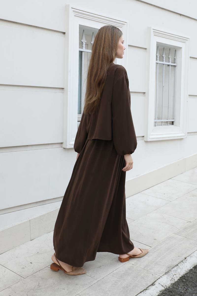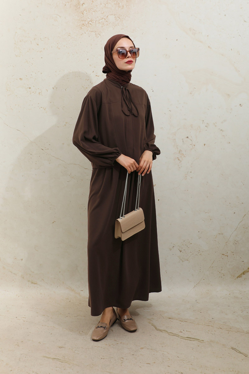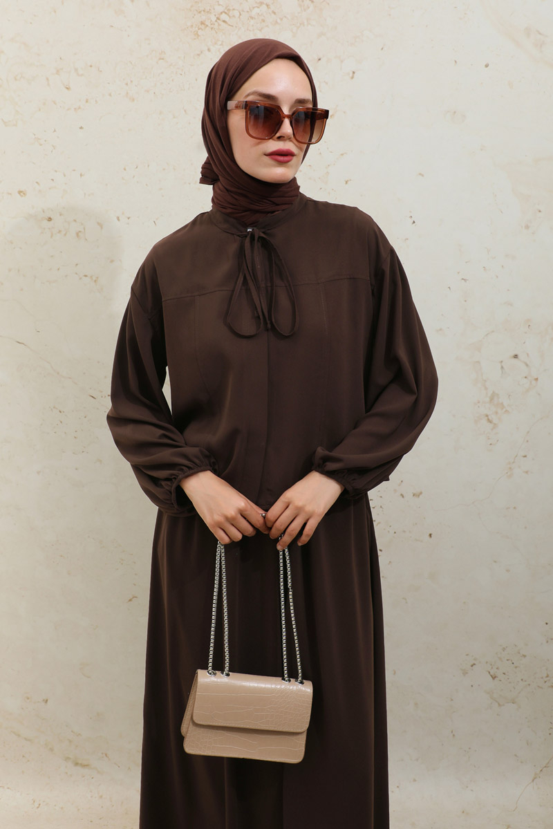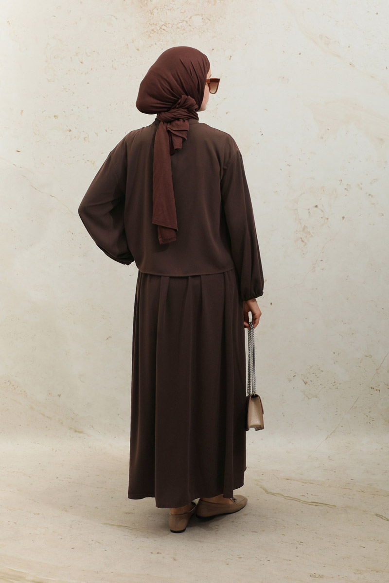 Yakası Bağcıklı Gömlek Etek Takım Acı Kahve. Yakasında ince biye ile bağlaması mevcuttu, gzili düğmelidir, düşük omuz, manşeti lastikli, dikiş detaylıdır. Etek beli lastikli, yandan cepli, astarsızdır.