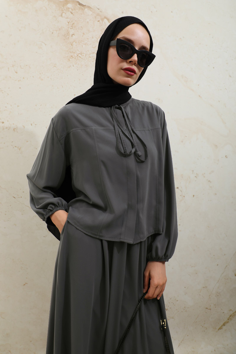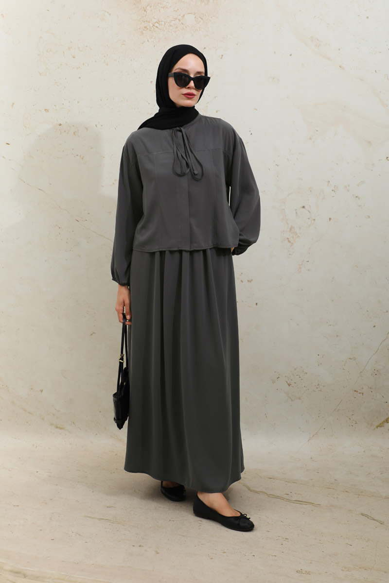 Yakası Bağcıklı Gömlek Etek Takım Füme