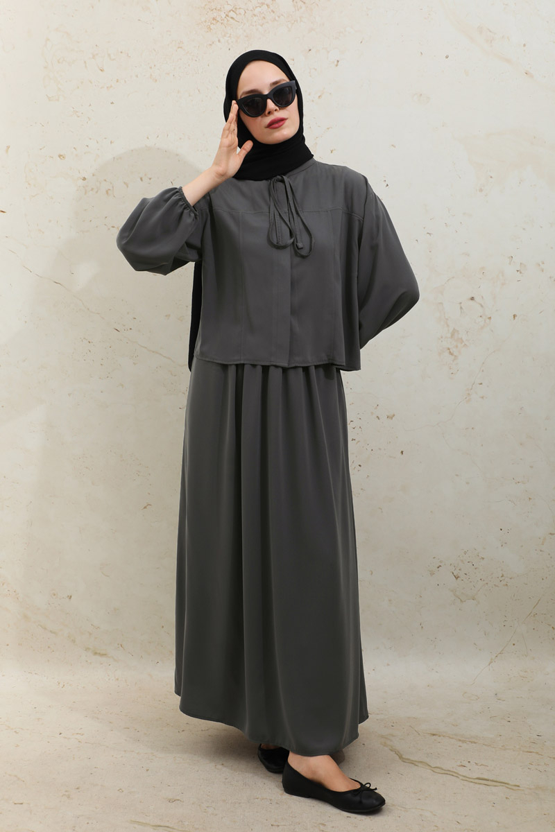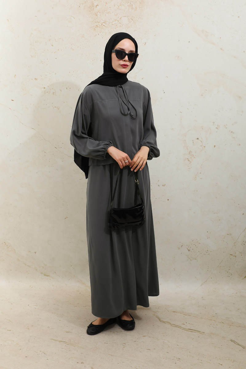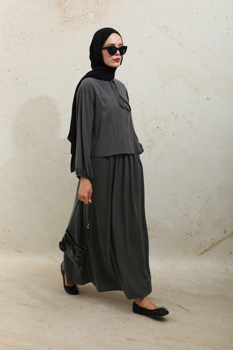 Yakası Bağcıklı Gömlek Etek Takım Füme. Yakasında ince biye ile bağlaması mevcuttu, gzili düğmelidir, düşük omuz, manşeti lastikli, dikiş detaylıdır. Etek beli lastikli, yandan cepli, astarsızdır.