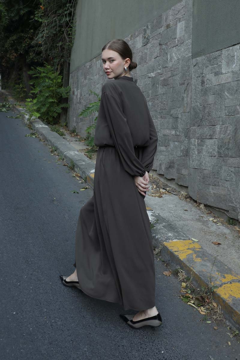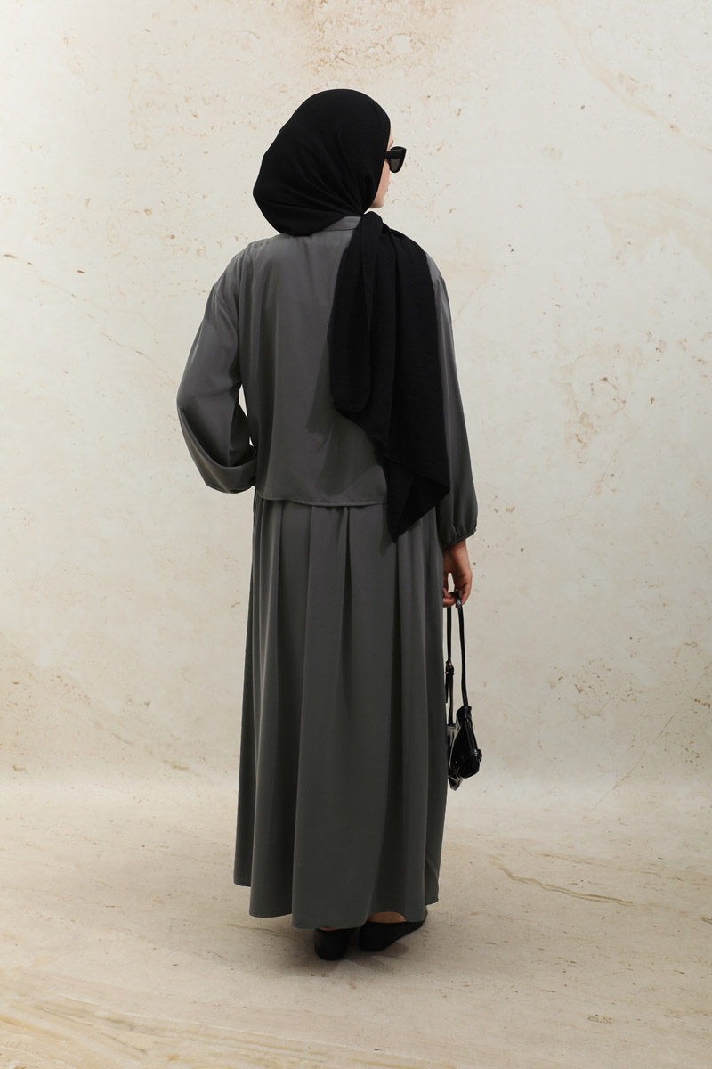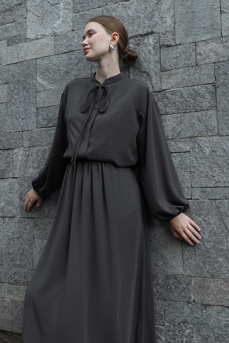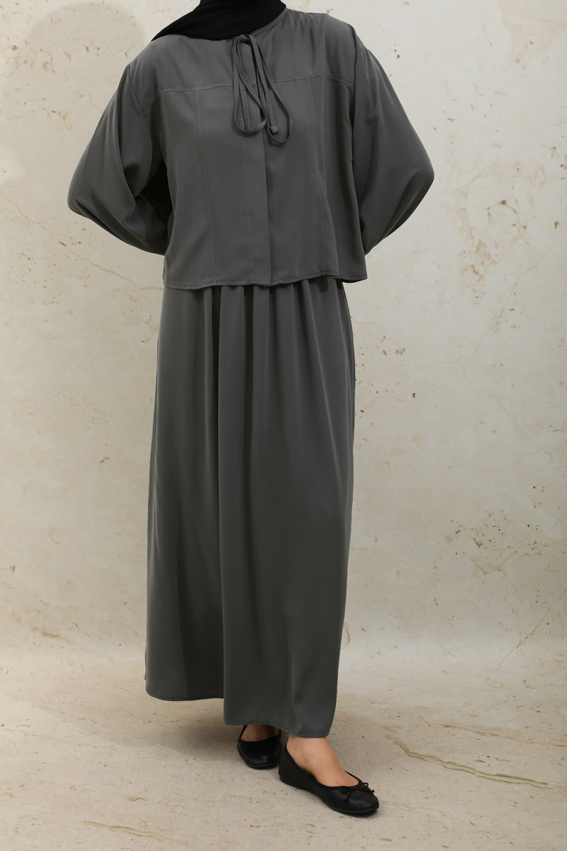 Yakası Bağcıklı Gömlek Etek Takım Füme. Yakasında ince biye ile bağlaması mevcuttu, gzili düğmelidir, düşük omuz, manşeti lastikli, dikiş detaylıdır. Etek beli lastikli, yandan cepli, astarsızdır.