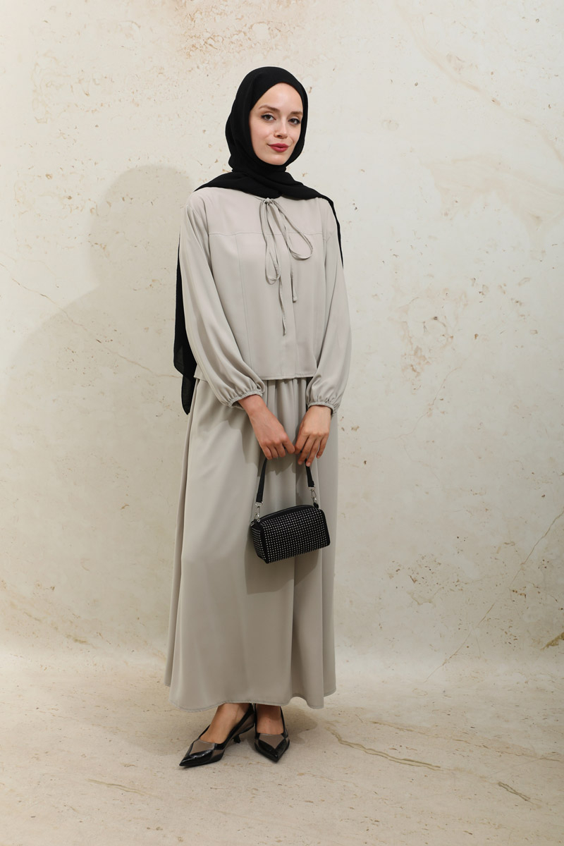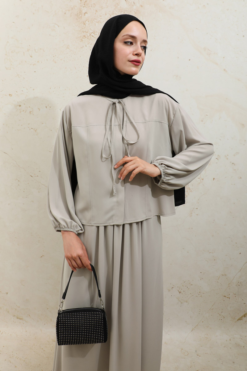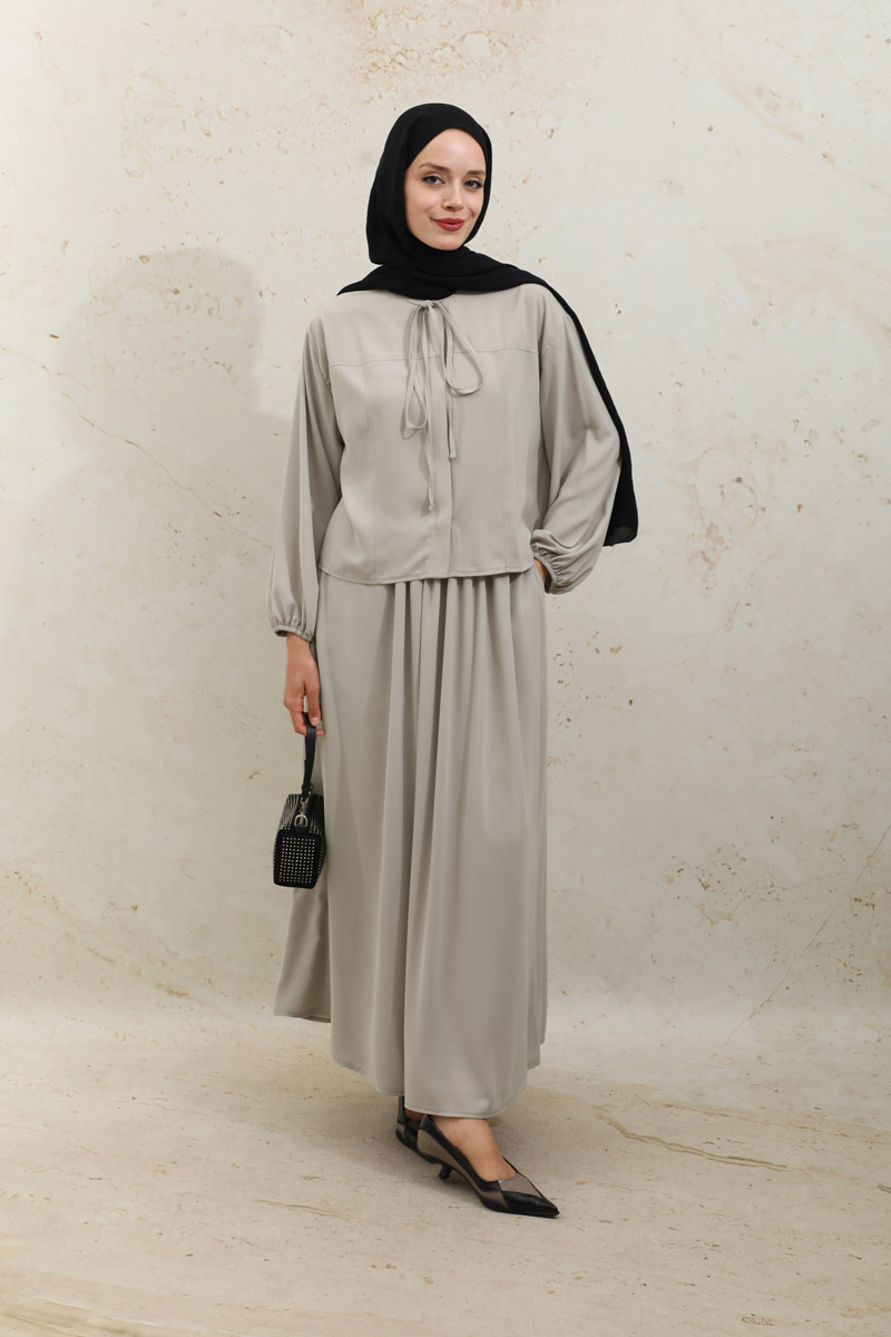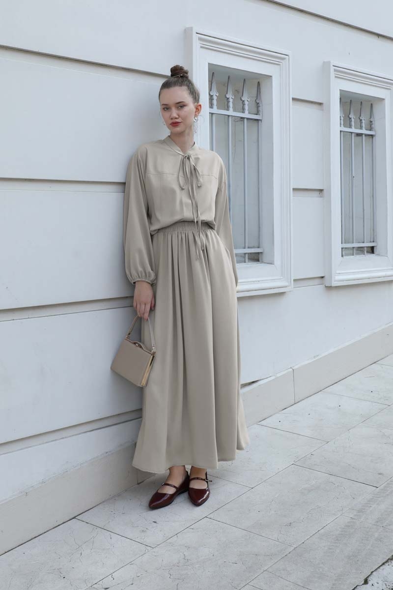 Yakası Bağcıklı Gömlek Etek Takım Taş