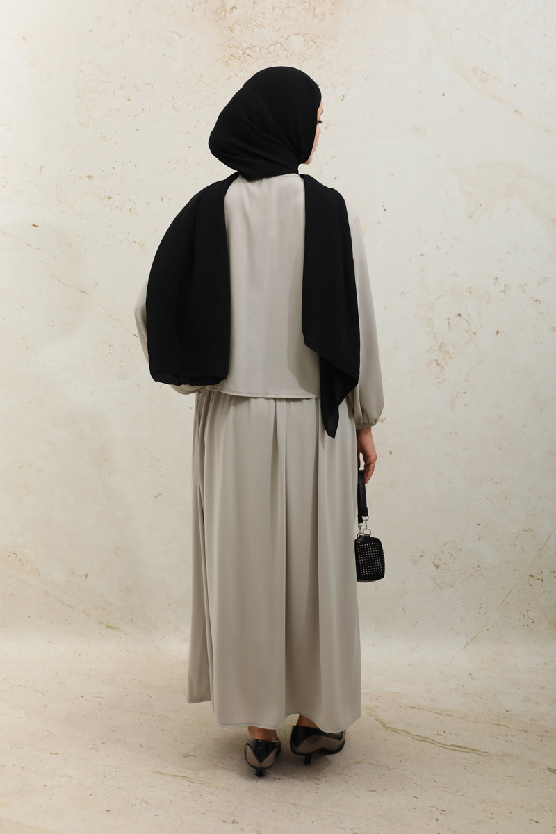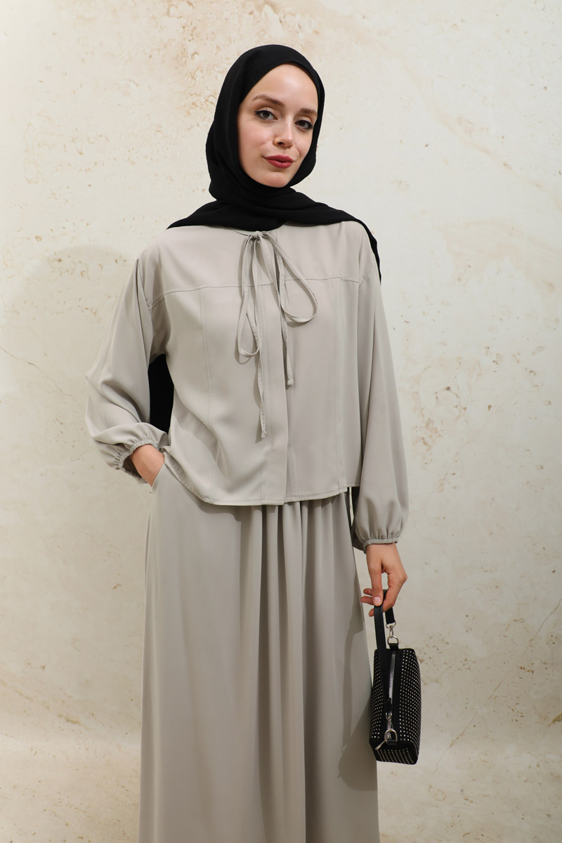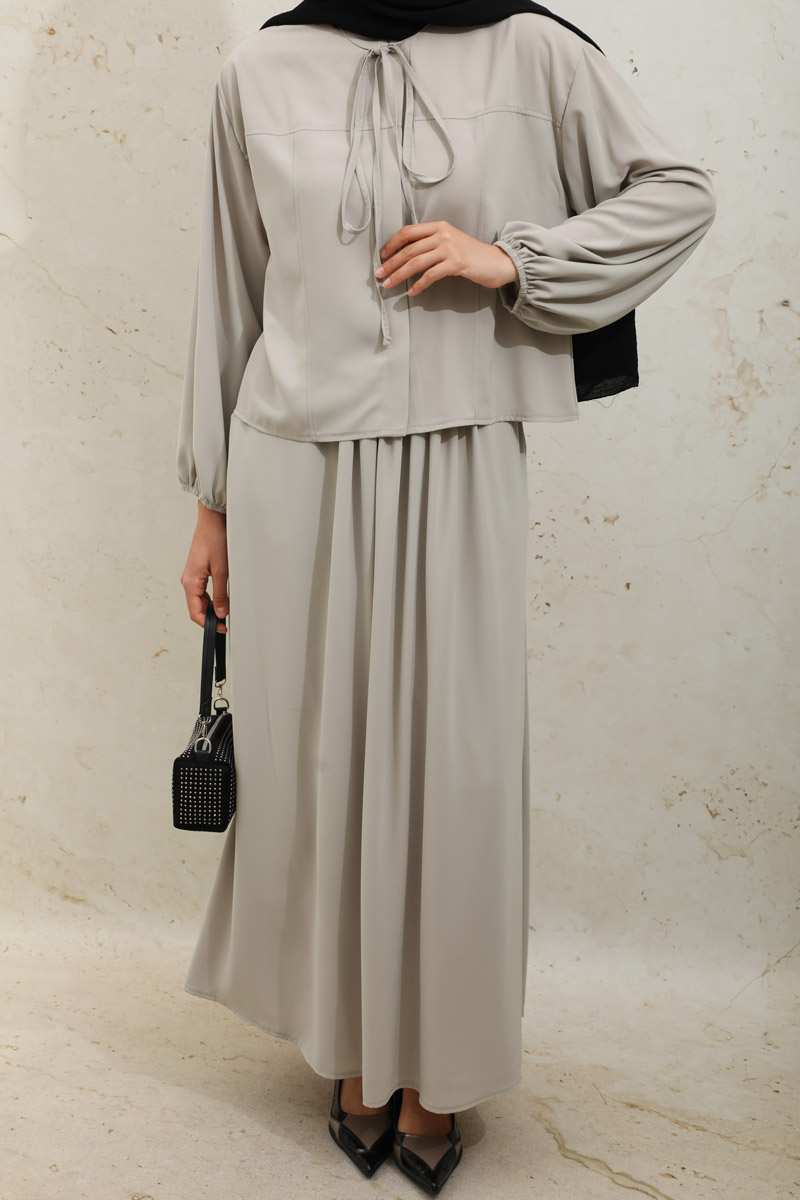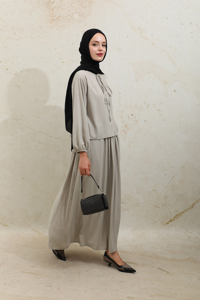 Yakası Bağcıklı Gömlek Etek Takım Taş