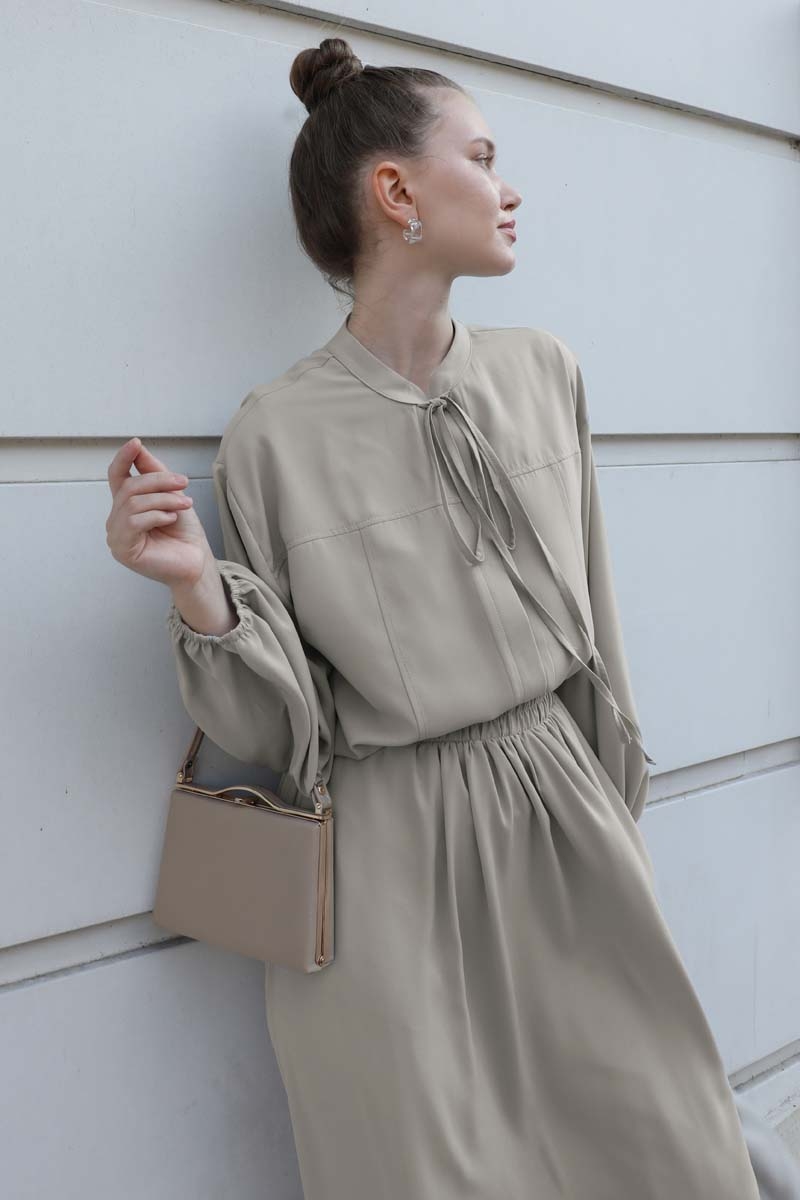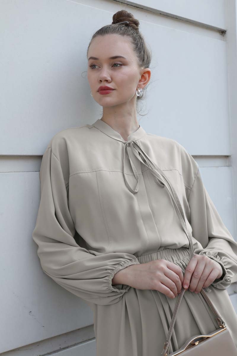 Yakası Bağcıklı Gömlek Etek Takım Taş. Yakasında ince biye ile bağlaması mevcuttu, gzili düğmelidir, düşük omuz, manşeti lastikli, dikiş detaylıdır. Etek beli lastikli, yandan cepli, astarsızdır.