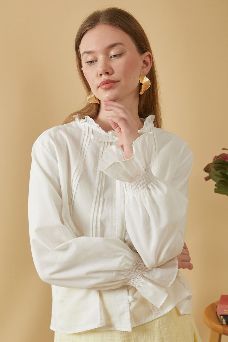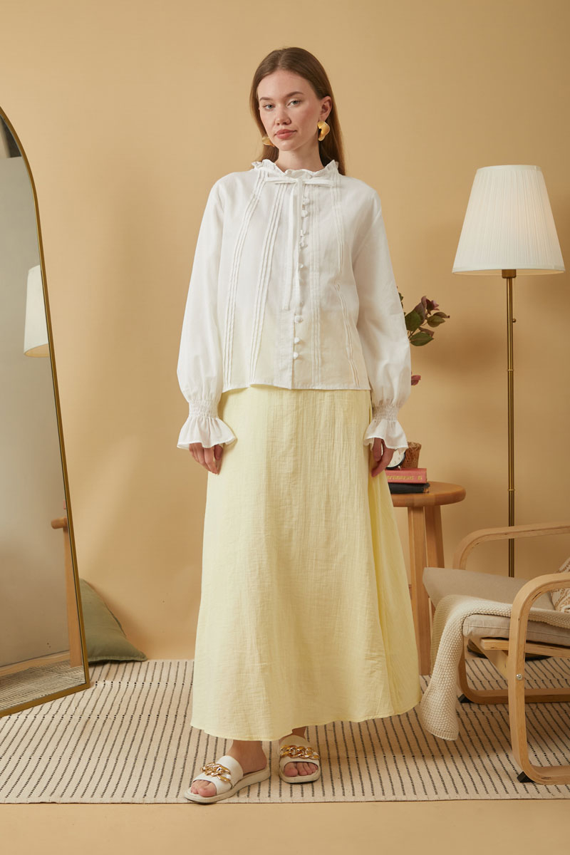 Yakası Bağcıklı Nervürlü Gömlek Beyaz, vual kumaştan üretilen bu gömlek, nefes alabilen yapısıyla konfor sunar. Yaka kısmındaki fırfır ve bağlama detayları, önündeki nervür detayı ve biye düğmelerle şık bir görünüm oluşturur. Rahat kesimiyle hem günlük hem de özel anlar için idealdir..